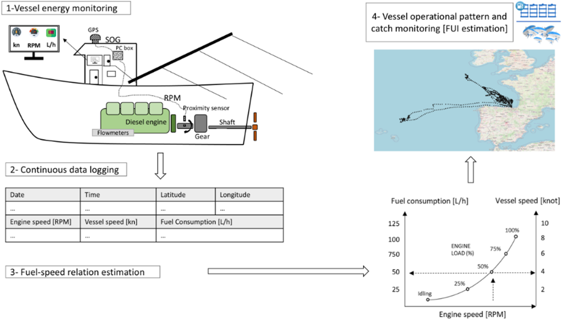 Decarbonisation requires of a good understanding of the different fisheries, their activity patterns, and their relationship with fuel consumption. Monitoring the vessels, i.e., their activity and consumption, has been highlighted as the first step in setting decarbonisation strategies due to the fact that it provides a detailed understanding of the vesselās production activity and its energy demand (Basurko etĀ al., 2023; KoriÄan etĀ al., 2023). According to some studies, the use of monitoring devices can save 5%ā15% of energy consumption due to the valuable information they provide in order to find the optimum point of instantaneous consumption versus vessel speed, during navigation and fishing (Basurko etĀ al., 2013; Notti and Sala, 2014). In the long-distance fleet, the energy-monitoring devices are more commonly used, but are not yet widespread for the smaller or artisanal fleet. The reasons could be the costs or the lack of innovative proactivity due to unawareness or funding possibilities (Basurko etĀ al., 2023). In addition, some authors suggested other developments from vessel operational data (i.e. date, time, speed, and course), with trajectory pattern assessments for fishing vessel behaviour identification and sustainable practices (Yang etĀ al., 2024).