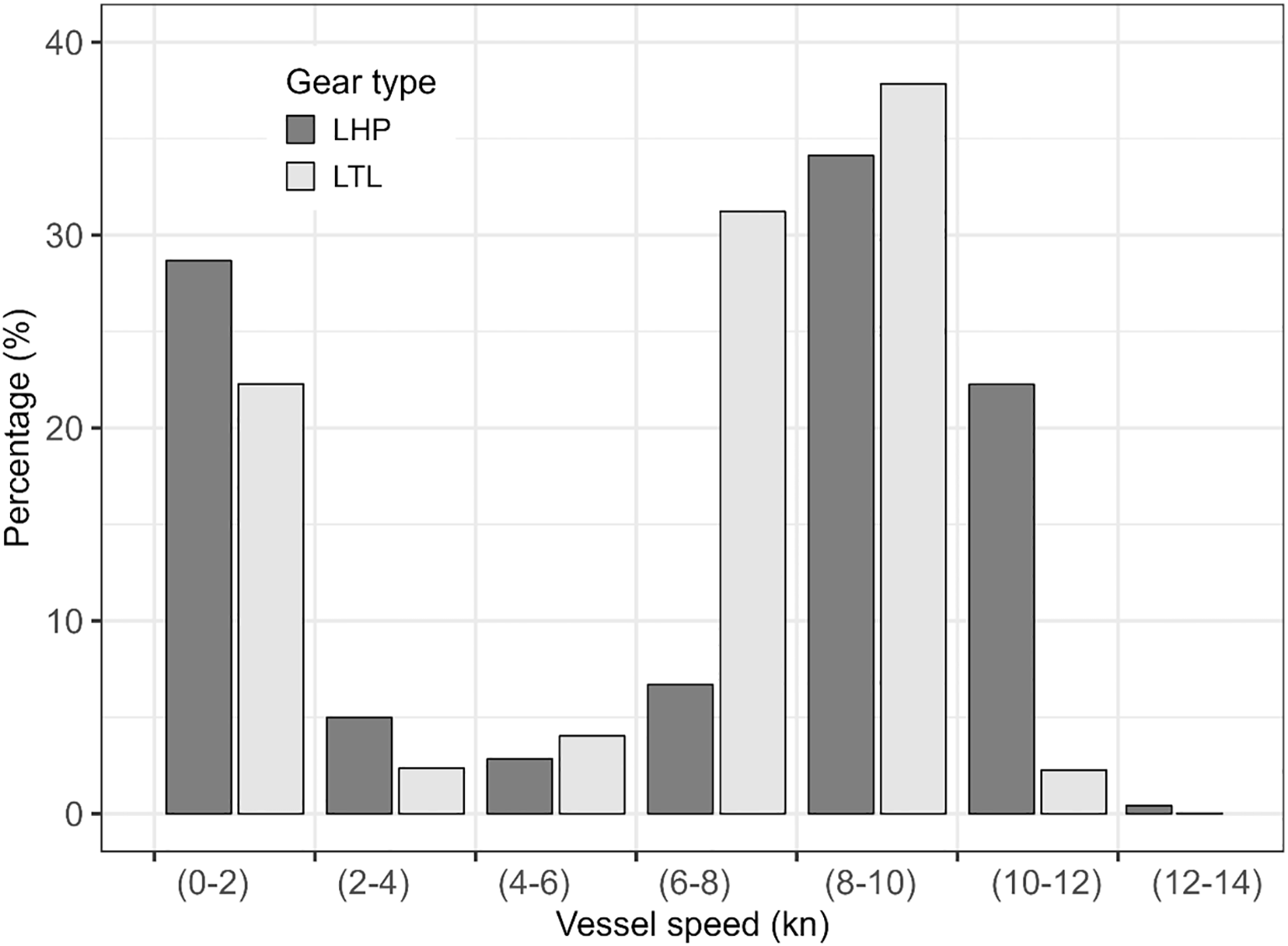 Details of the operative patterns of the vessels from both gear types (LTL and LHP) operated in the same fishing areas (Bay of Biscay and northeast Atlantic Ocean) during the tuna season (from mid-spring to mid-autumn) from 2015 to 2019 are shown in TableĀ 4. LTL vessels were smaller in size (average 24 m) than LHP (average 35 m), their crews were one-third the size of those in LHP, and they had different fishing and operative patterns as reflected in the diverse speed patterns present through the fishing trips (FigureĀ 3). LTL vessels operated 67% of the time in high engine loads, above 6 knots, during trolling and sailing to port or even to another fishing ground (FigureĀ 3). Specifically, 51% of their time was spent trolling when fish schools disaggregated. In contrast, LHP vessels devoted 59% of the time in high engine loads, and this occurred when searching for fish schools and sailing to port or even to another fishing ground. Furthermore, fishing operation using rods represented less than 40% of the time; this activity was undertaken at very low propulsion loads, very slowly, following the aggregated schools of fish. At night, both LTL and LHP vessels stopped their fishing activity and left adrift navigating at less than 1 knot. Sometimes, nights were used to reach new fishing grounds.