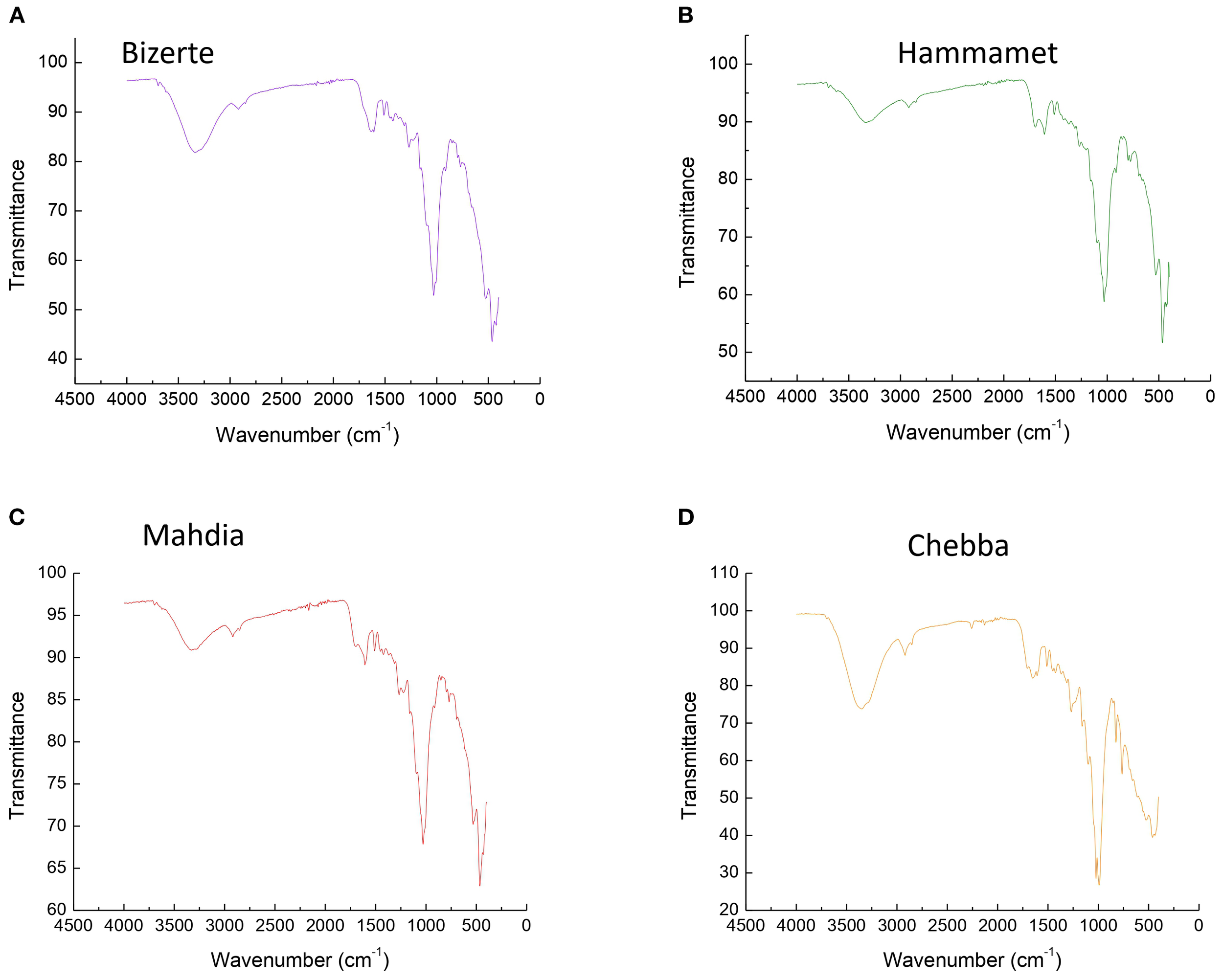 Polymers of microplastic obtained from FTIR spectroscopy reads found in (A) Bizerte, (B) Hammamet, (C) Chebba, and (D) Mahdia (assigned characteristic peaks in cm−1).