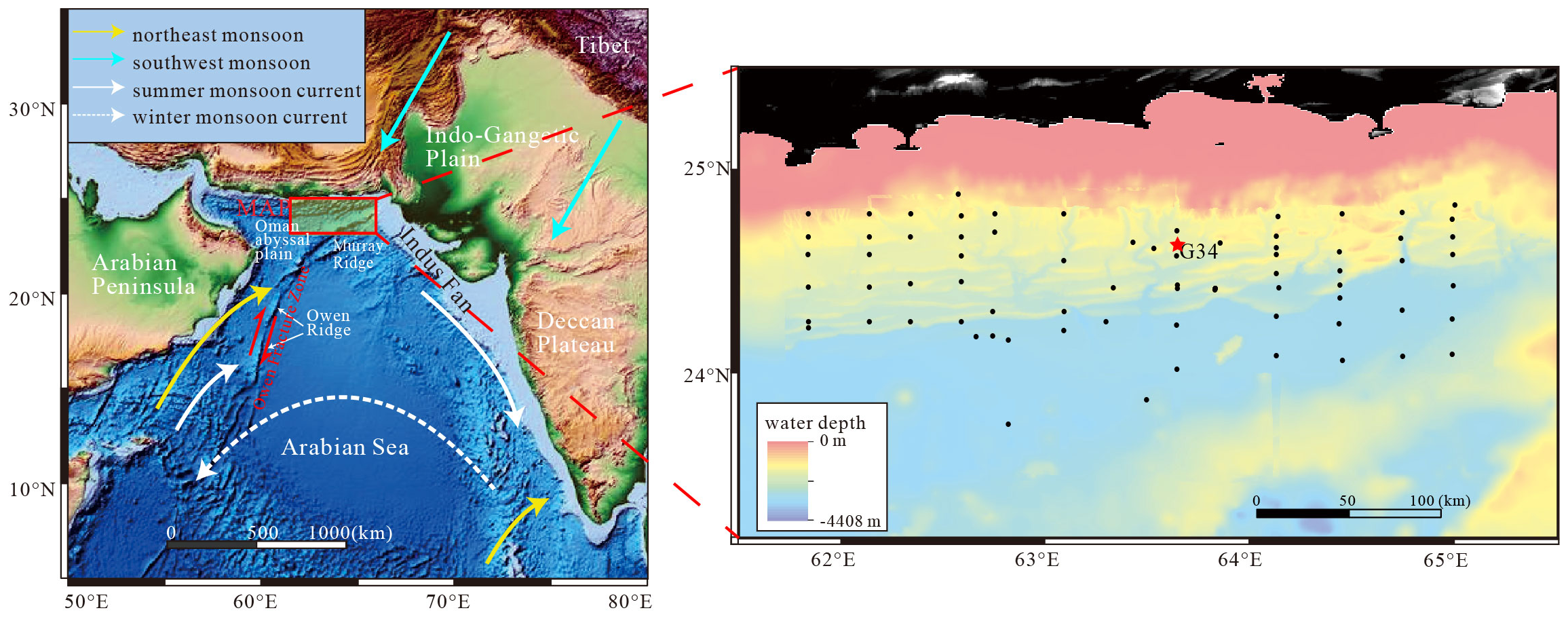 Previous studies suggests that the deposition process of the MAP is controlled by several factors: (1) The Indus River in the northeast carries a high flux of terrestrial debris, while the floods carry coarse-grained terrestrial debris as turbidity deposit (Bourget et al., 2011); (2) Winter winds generated by low-pressure cyclones in the Mediterranean region cross the Arabian continent carry a large amount of dust materials into the Arabian Sea (Prins et al., 1999; Clemens and Prell, 2003); (3) Marine organisms in the Arabian Sea and erosional materials from the seafloor also have some contribution (von Rad et al., 1999; Luckge et al., 2001; Fleitmann et al., 2007; Thamban et al., 2007).