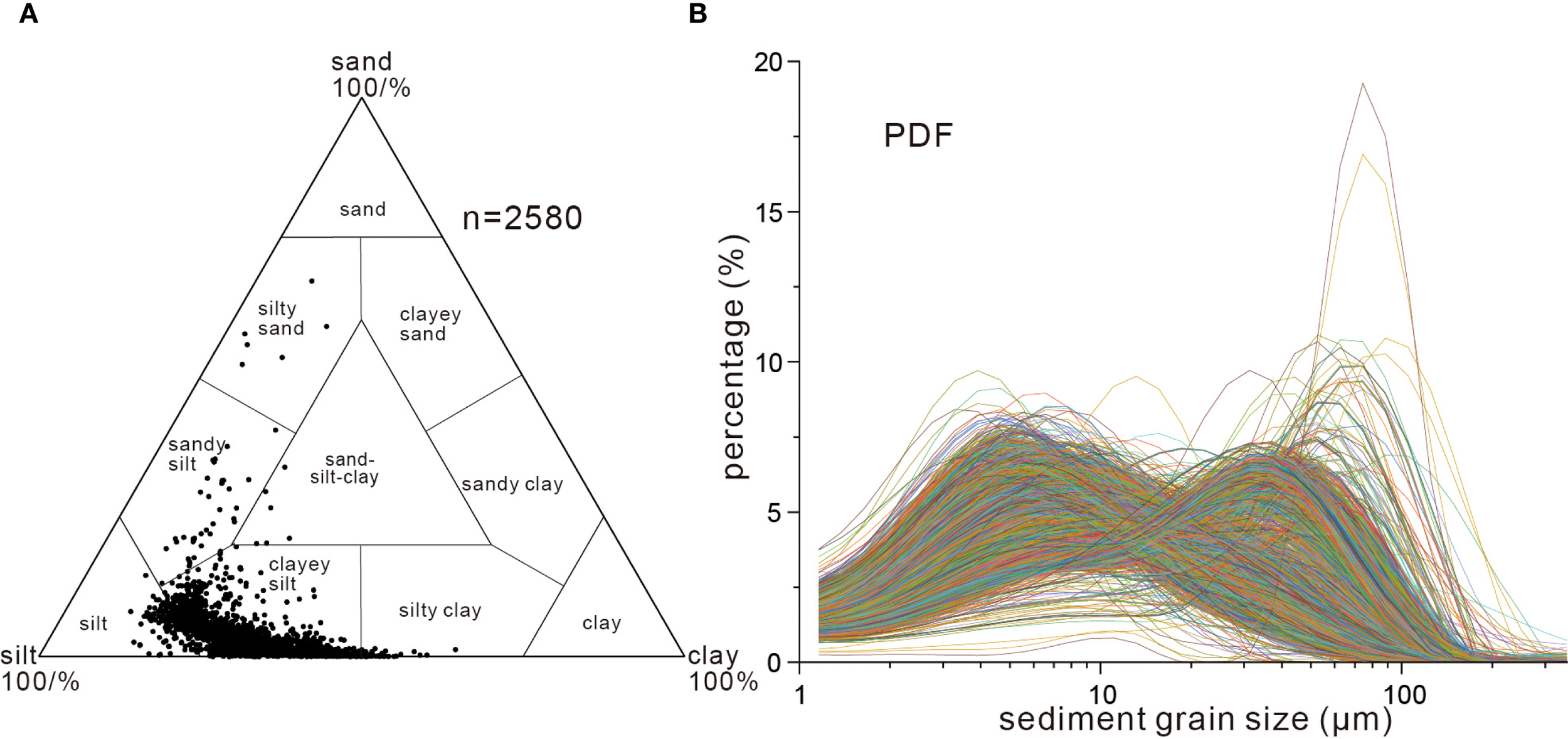Shepard’s nomenclature of sediments based on sand-silt-clay (A) and sediment grain-size distribution of samples from all cores (B). PDF, probability density function.