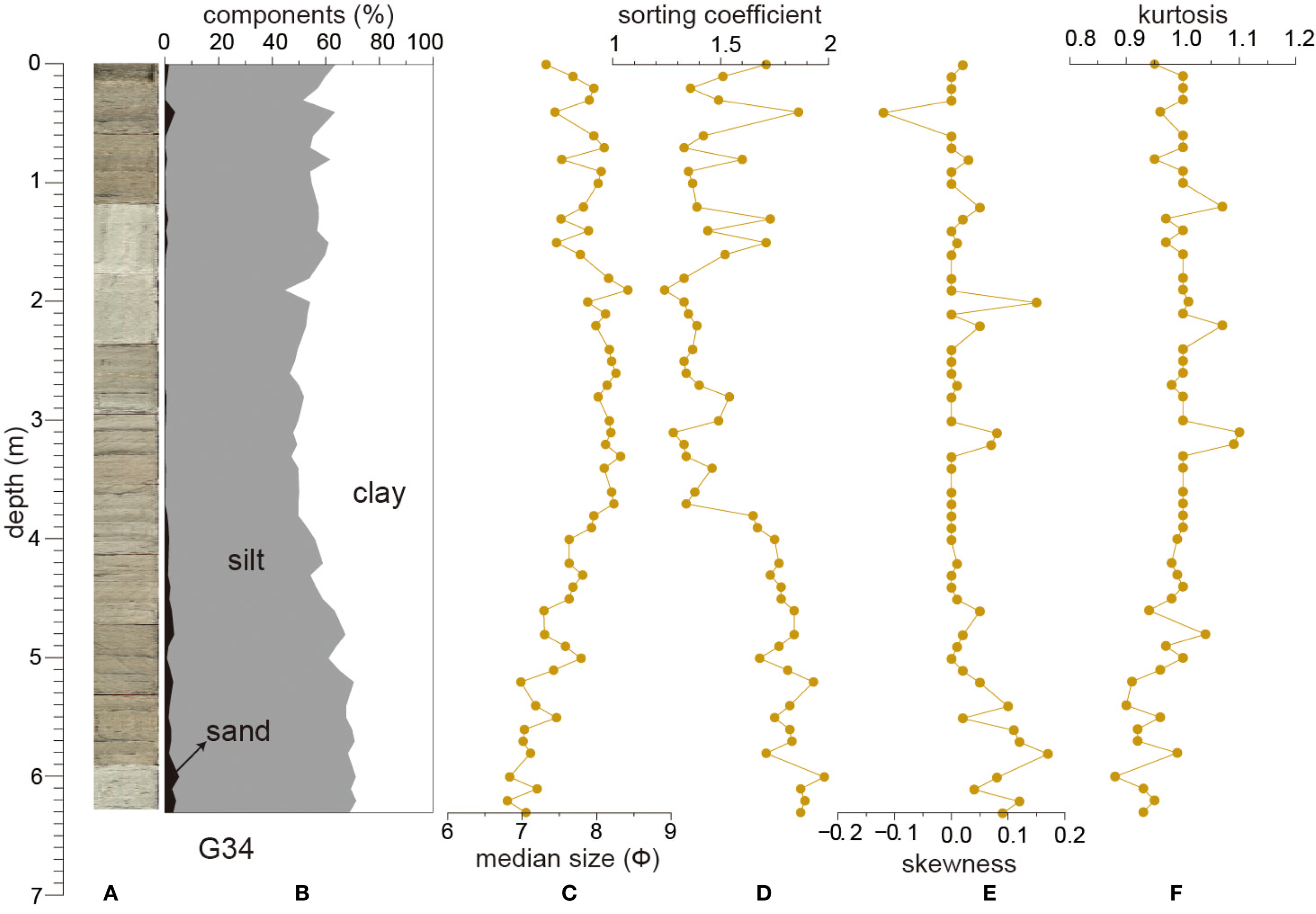 Grain-size characteristics of core G34. (A, B) photograph and grain-size composition of core GC34; (C–F) median size, sorting coefficient, skewness and kurtosis of core GC34.