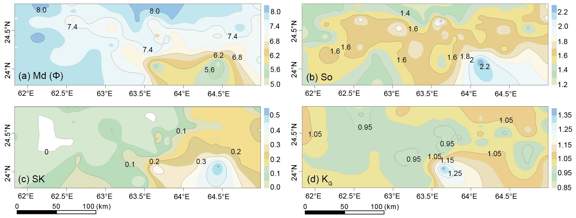 For spatial distribution, regional sediments are fine, well sorted, positively skewed, and with moderate kurtosis, and become coarser to the south (Figure 4). In the southeast, the sediments become coarser, with a median size of about 5.0 Φ-6.8 Φ, bad sorted with the sorting coefficients (σ) up to 2.28, likely attributed to the influences of the Indus River.