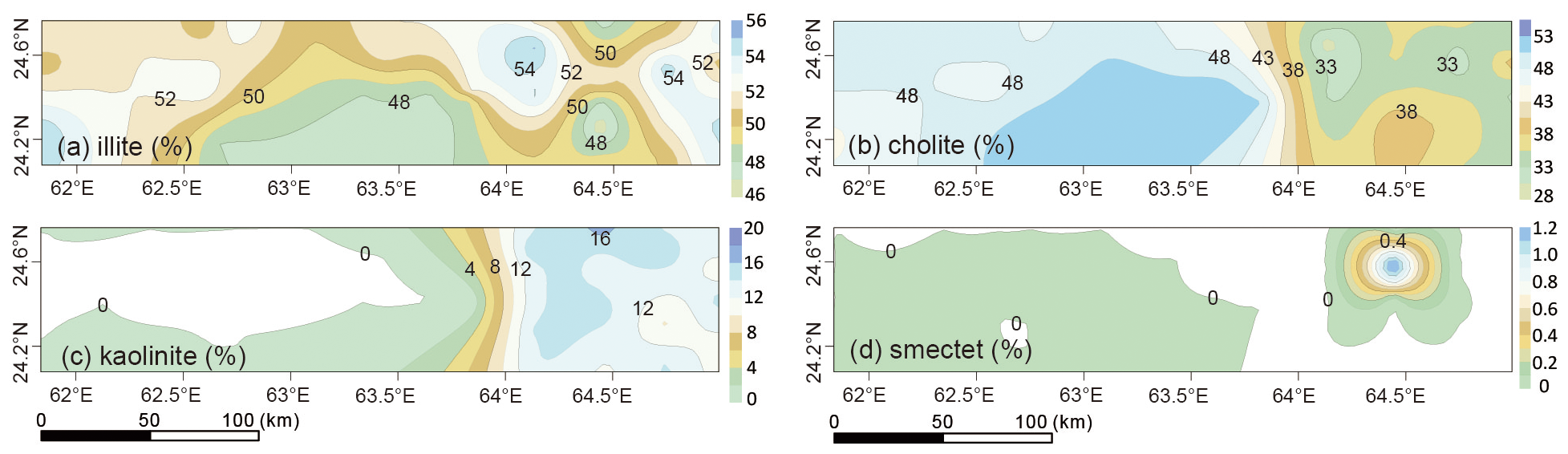 For spatial distribution (Figure 5), clay minerals are dominated by illite (46.4%-55.3%) and chlorite (29.0%-55.0%). Kaolinite increases in the east, up to 16.7%, but decreases in the west. Smectite is rare in the whole area, usually less than 1%.