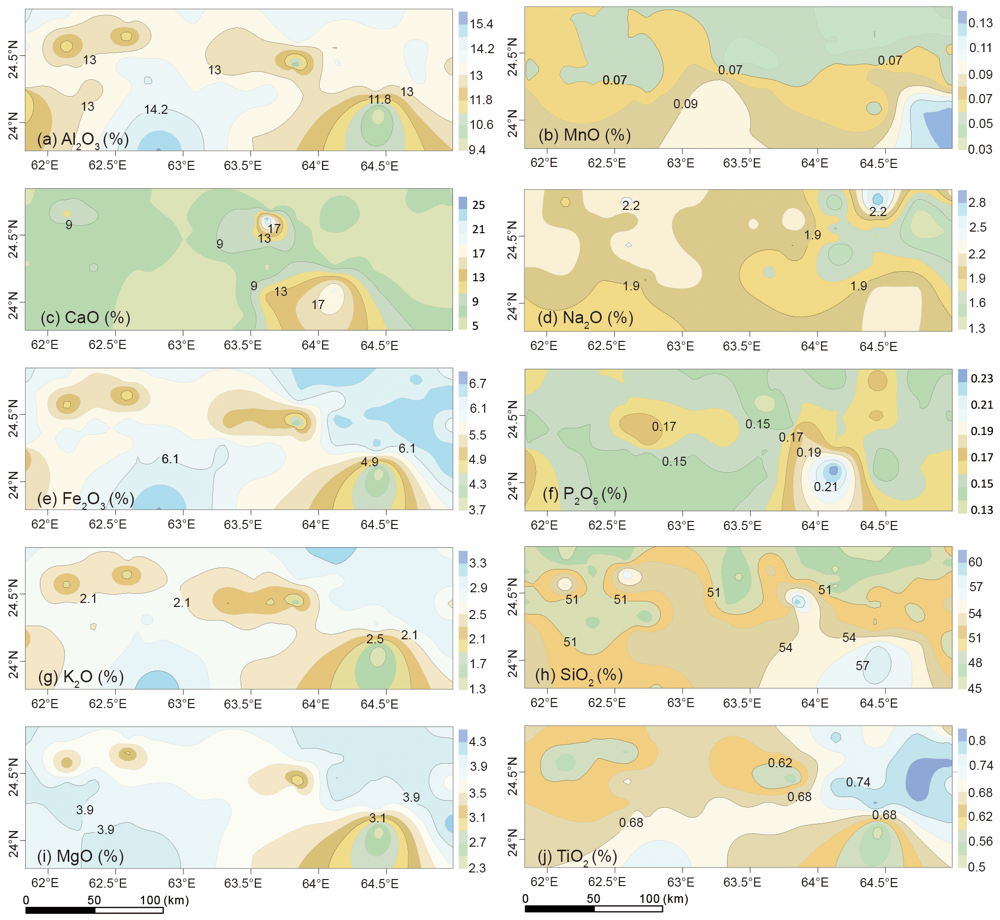 Spatial distribution patterns of major elements oxides of sediment samples in the MAP. (a) Al2O3, (b) MnO, (c) CaO, (d) Na2O, (e) Fe2O3, (f) P2O5, (g) K2O, (h) SiO2, (i) MgO, (j) TiO2.