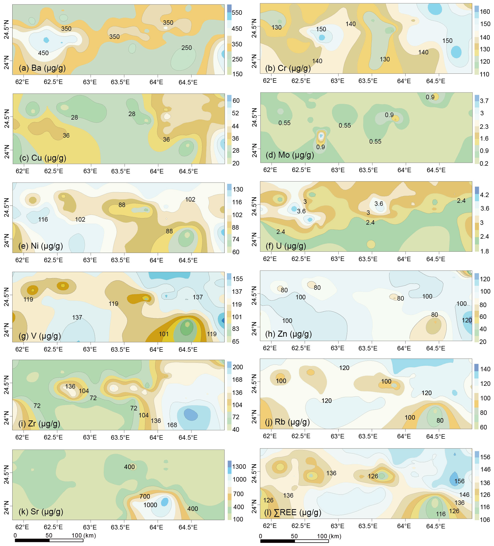 Spatial distribution patterns of trace elements of sediment samples from the MAP. (a) Ba, (b) Cr, (c) Cu, (d) Mo, (e) Ni, (f) U, (g) V, (h) Zn, (i) Zr, (j) Rb, (k) Sr, (l) ∑REE.