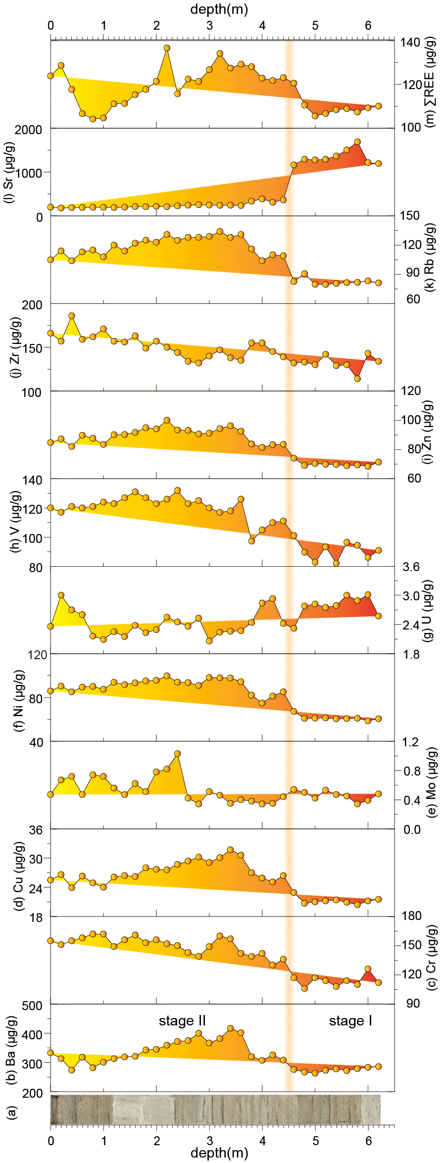Spatial changes in trace elements are relatively stable than major elements (Figure 8). In specific, most of the trace elements, such as Cr, Cu, Mo, Ni, U, V, Zn, Zr, Rb, and REEs, are relatively similar, while element Sr ranges from 163 µg/g (G50) to 1287 µg/g (G52), consistent with that of Ca. In addition, Co, Cu, Ba, Cr, Rb, Ni and Zn contents in the sediments in the west are relatively high, while Sr concentrates in the east. For core G34, changes in trace elements can be similarly divided into two groups (Figure 9): in the stage I, Sr content is >1000 µg/g and decreased sharply in the stage II (above 4.6m). Some trace elements, including Cr, Cu, Ni, V, Zn, and Rb, exhibit an opposite variation, while the others, such as Ba, Mo, U, Zr, and REEs, varies without any patterns.
