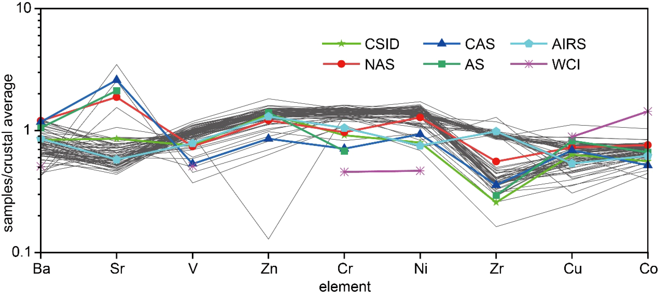 Correlation analyses on the elements in the surficial sediments of the study area were carried out and the results are shown in Table 2. As shown, Al2O3 is positively correlated with MgO, K2O, TiO2, Fe2O3, Co, Cr, Ni, Rb, Ga, V, and REE (Dubinin, 2004), and negatively correlated with CaO and Sr. Al2O3, MgO, K2O and Fe2O3 are the main components from rock weathering, and TiO2, Ga, and other elements are mainly derived from terrestrial detritus, which are mainly enriched in fine-grained sediments and endowed in a sorbed state in clay minerals. Hence, Al2O3, MgO, K2O, Fe2O3 and TiO2 likely represent terrestrial clastic fractions, and CaO and Sr are mainly related with biogenic carbonate fractions, which were less deposited in the MAP and mutually exclusive with other elements (Avinash et al., 2016).