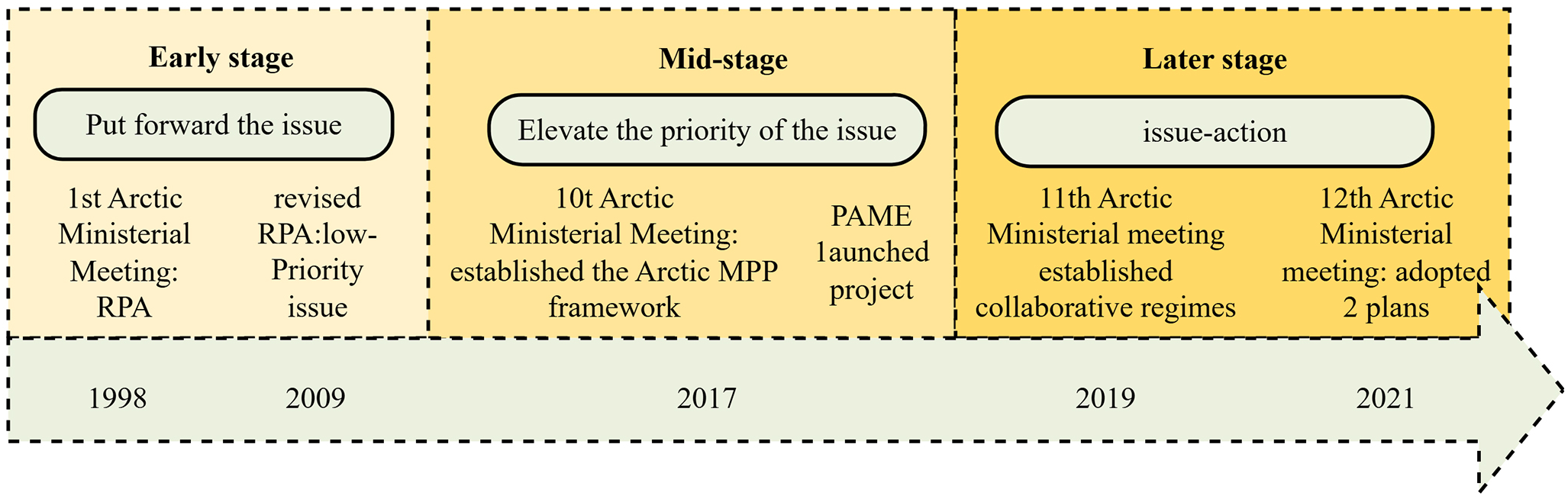 In the early stage of issue setting in the Arctic Governance, the Arctic Council demonstrated early recognition of marine plastic pollution as a significant environmental threat through its foundational governance mechanisms. In 1998, the first Arctic Ministerial Meeting adopted the Regional Programme of Action for the Protection of the Arctic Marine Environment from Land-based Activities (Arctic RPA), establishing the first regional framework for Arctic marine pollution control. The objectives of the RPA are to take action individually and jointly, which will lead to the prevention, reduction, control, and elimination of pollution in the Arctic marine environment and the protection of its marine habitat (AC, 2009). Although the 2009 revision of the RPA initially categorized marine litter as a lower-priority concern, this policy instrument nevertheless played a crucial issue-setting role in the Arctic’s emerging plastic pollution governance framework.
