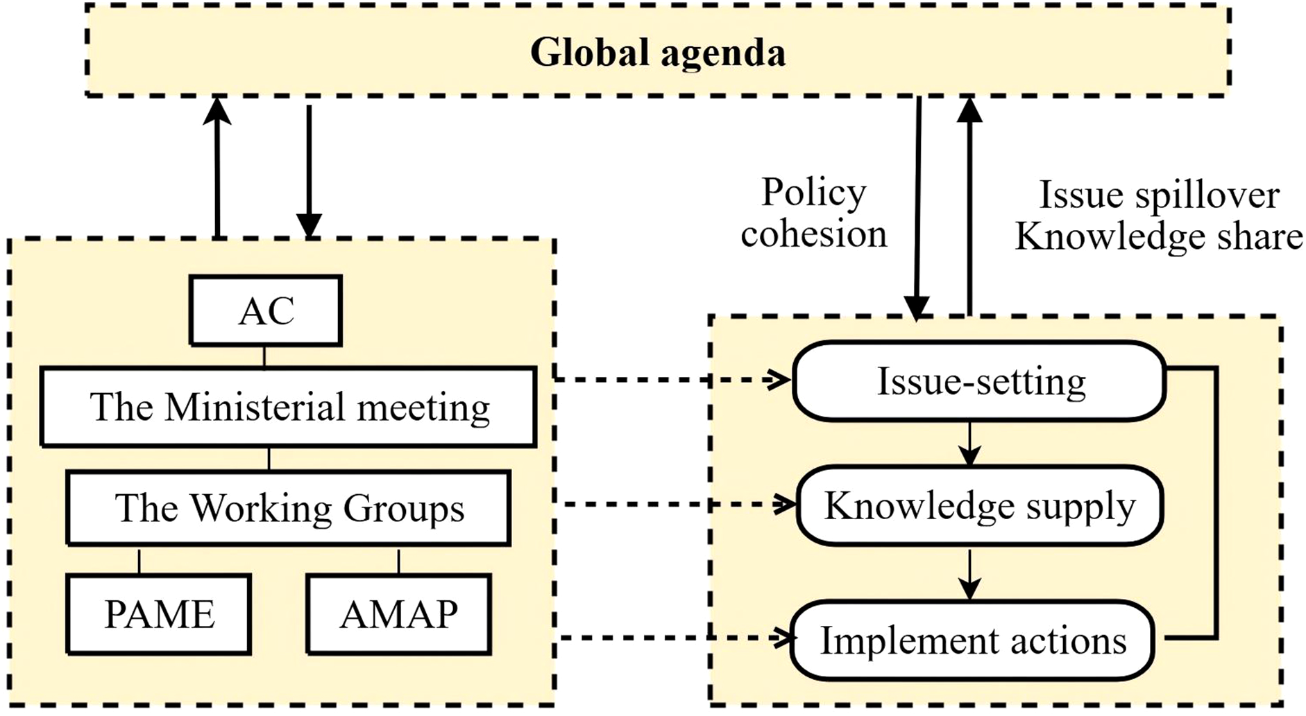 As an emerging environmental challenge, marine plastic pollution has been on the Arctic Council’s agenda since its establishment. Recognizing its growing significance, the Council has systematically elevated this issue through successive Ministerial Meetings, effectively institutionalizing Arctic marine plastic pollution as a priority concern within the governance framework. As shown in Figure 1, this issue-framing process illustrates how the Arctic Council has gradually elevated the importance of governing Arctic marine plastic pollution. Through this strategic issue-setting, the Arctic Council has further enabled the alignment of regional governance actions with global environmental agendas.