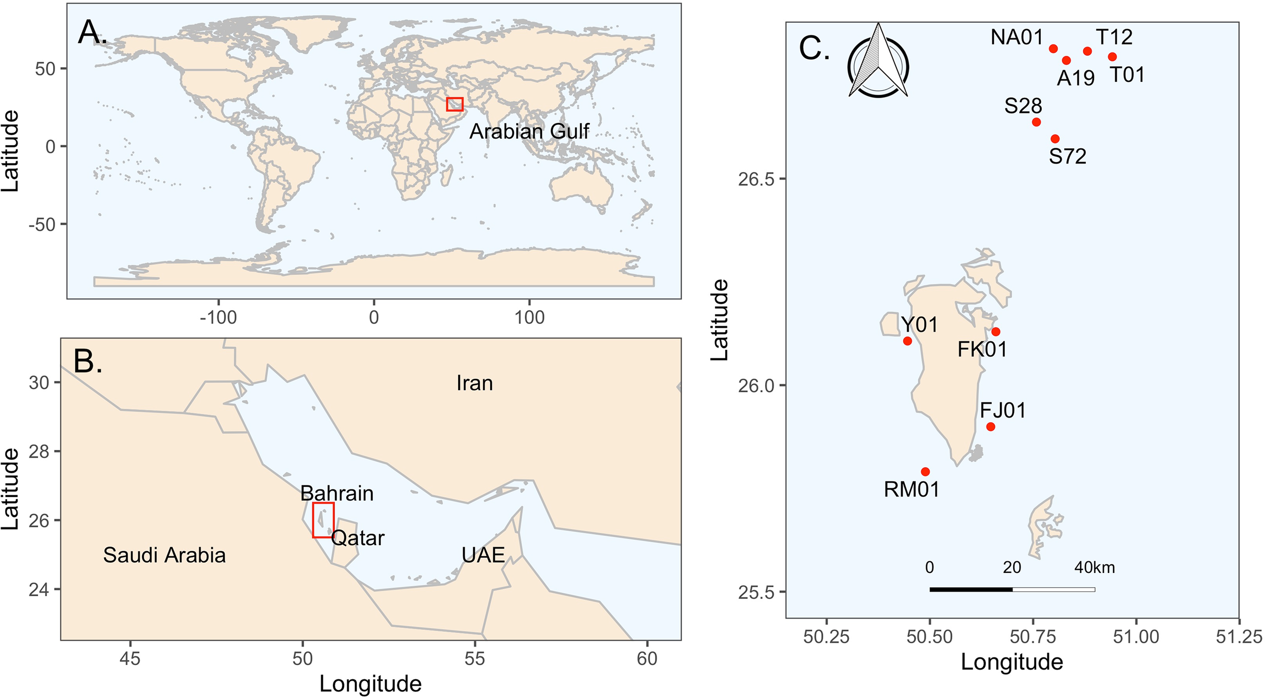 Figure 1. Location of study sites (A) Location of Arabian Gulf (AG); (B) Location of Bahrain within the AG; (C) Location of selected study sites within Bahrain [Site codes: Northern Hayrat Waters: (1) Hayr Shtayyah (S28); (2) Hayr Shtayyah (S72); (3) Hayr Bu Amamah (NA01); (4) Hayr Bu Amamah (A19); (5) Hayr Bul Thamah (T01); (6) Hayr Bul Thamah (T12); (B) Eastern Waters: (7) Falkland, Fasht Al Adhm (FK01); (8) Fasht Al Jabbari (FJ01); (C) Western Waters (9) Yassouf (Y01); (10) Ras Al Mumtallah (RM01)].