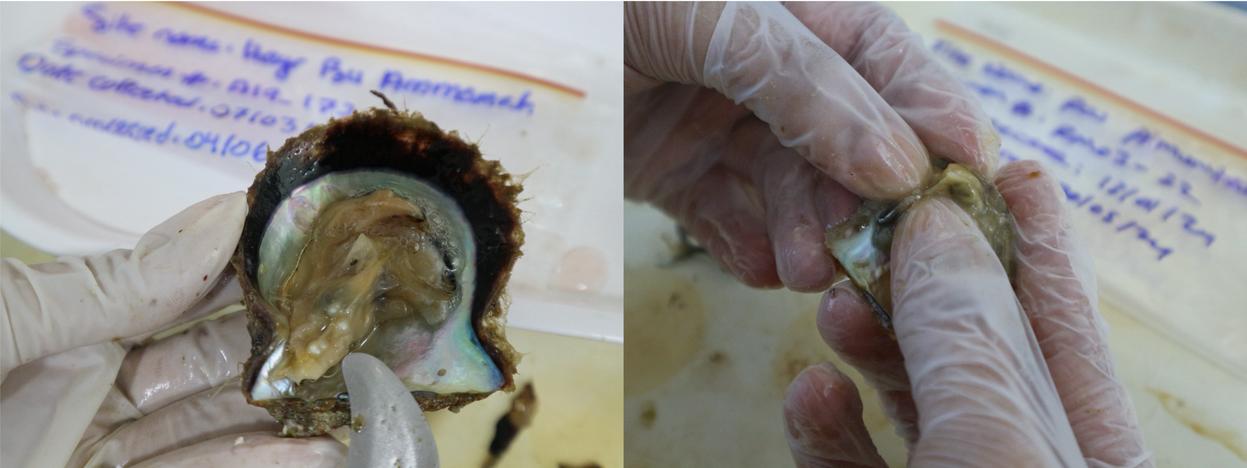 After species identification and measurement collection, all pearl oysters were meticulously searched for pearls through a visual inspection. The oyster surface flesh inspection was done following which a thumb was run across the mantle to feel for any pearls, then a shucker is used to flip over the muscle and search underneath. This was done for both sides of the oyster. In the case a pearl was found, a photo was taken in its place of discovery before being transferred into a glass bottle (Figure 2). The presence of pearls, number of pearls found in the specimen, the specimen number, site, date collected and date processed were recorded.