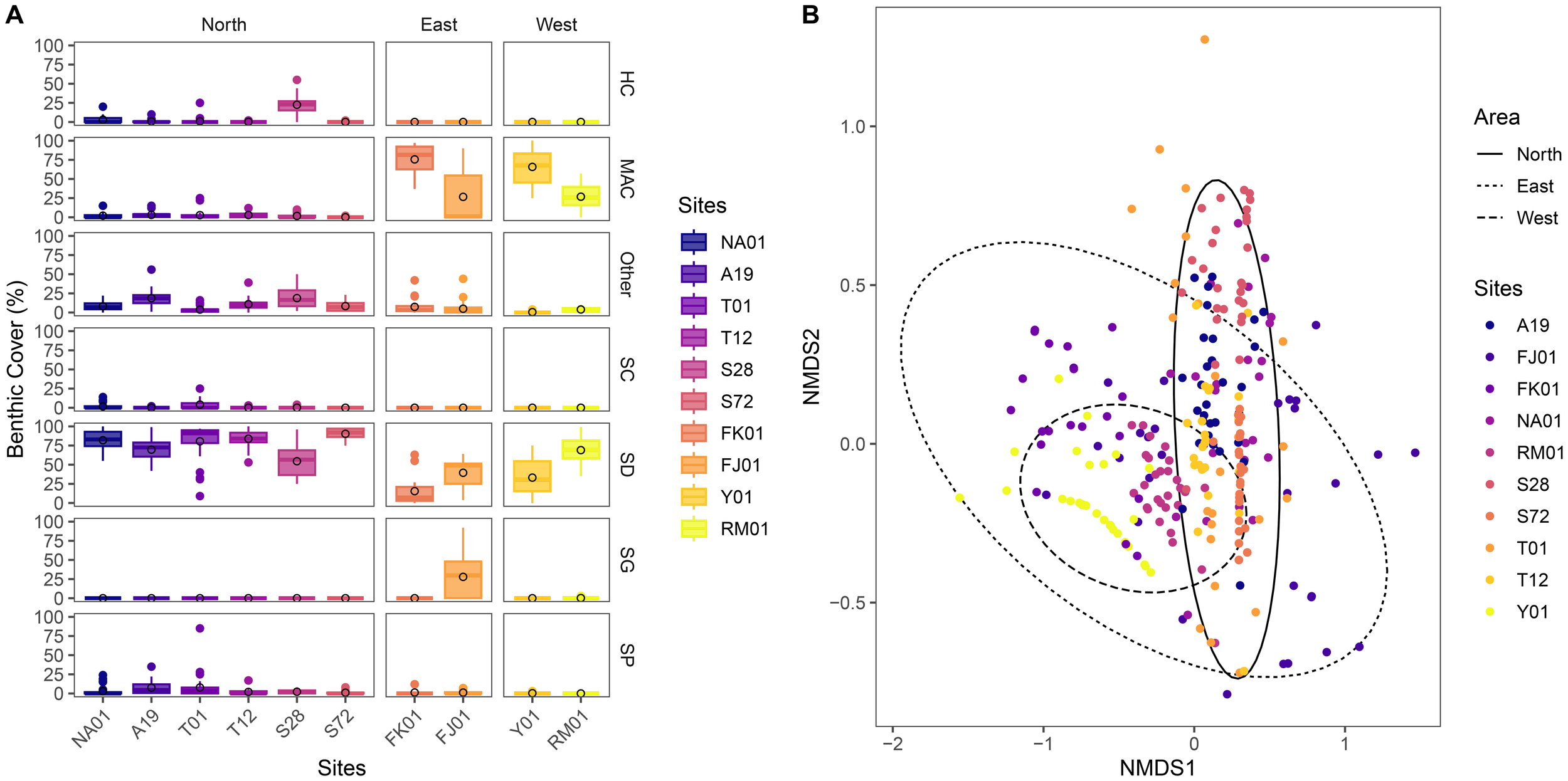 Figure 3. Benthic composition of the pearl oyster beds in the kingdom of bahrain. (A) Box plots showing the distribution of the percent cover of major benthic groups (i.e. HC = hard corals, SC = soft corals, SG = seagrasses, MAC = macroalgae, SP = sponge, SD = sand, and Others = includes rock, rubble, ascidians, hydroids, crustose coralline algae and bivalves) across ten reef sites - (I) Northern Area are represented by sites: NA01 and A19 (Hayr Bu Amamah); T01 and T12 (Hayr Bul Thamah); S28 and S72 (Hayr Shtayyah); (ii) Eastern Area: FK01 (Falkland, Fasht Al Adhm) and FJ01 (Fasht Al Jabbari); (iii) Western Area: Y01 (Yassouf) and RM01 (Ras Al Mumtallah). The unfilled circles within each plot represent the mean percent cover for that benthic group at the site. (B) Non-metric multidimensional scaling (NMDS) plot visualizing the differences in benthic community structure among Eastern, Northern, and Western oyster beds. Each point represents a quadrat, coloured by site, and ellipses indicate 95% confidence intervals around area groupings, highlighting spatial separation in benthic composition.