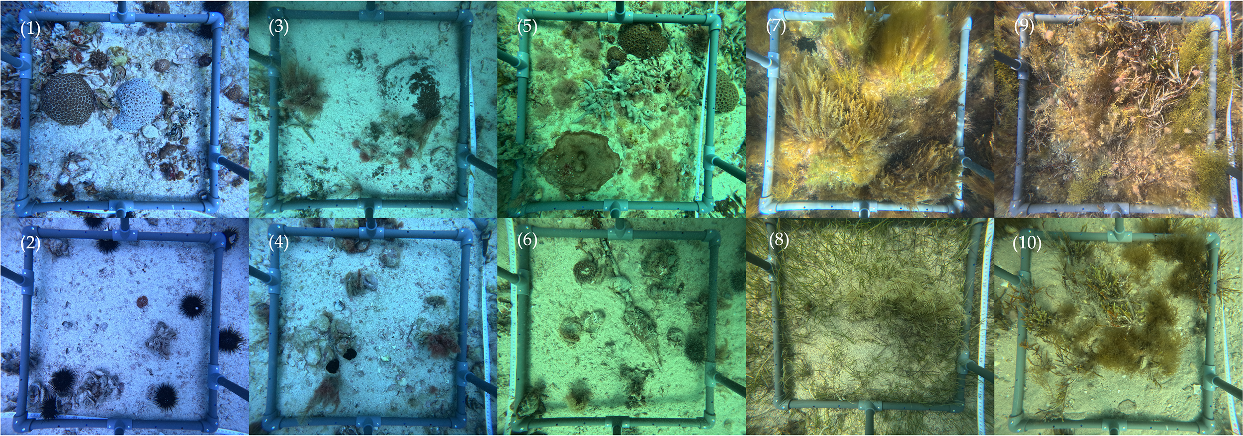 During the dives, both qualitative and quantitative observations of the epibiota were made within each quadrat and along the transects at each site. These observations were documented through photographs to assess benthic community composition which was classified into major life form groups: hard corals, soft corals, seagrasses, macroalgae, sponge, sand, and others (includes living and non-living categories such as rock, rubble, ascidians, hydroids, crustose coralline algae and bivalves). For the purposes of this study, the term benthic hereafter refers specifically to these defined life form groups.
