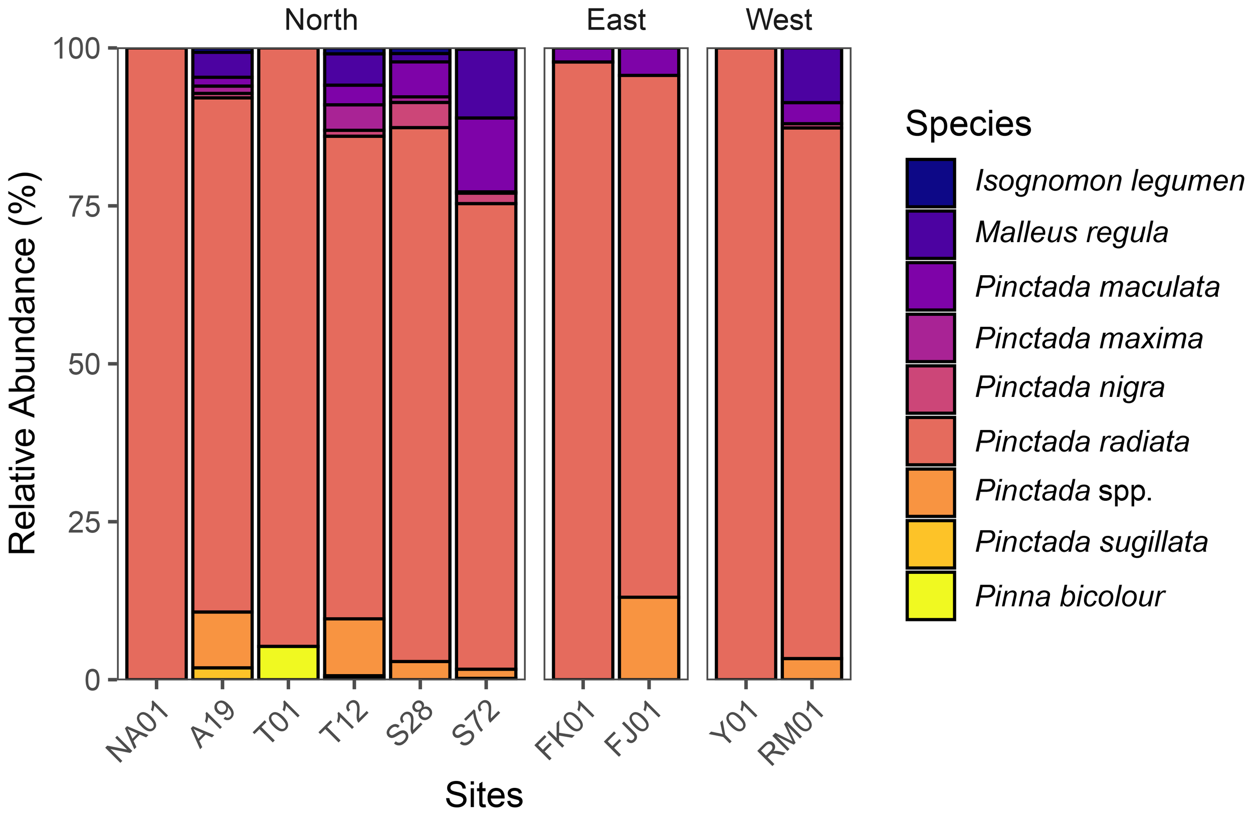 In the eastern waters, P. radiata had the highest relative abundance at site FK01 (97.8%) and FJ01 (82.6%), however, the remaining species were noted to be absent from these sites with the exception of Pinctada maculata which was present at both sites but in much lower numbers (2.2% at FK01 and 4.3% at FJ01) (Figure 5). In addition, an unidentified Pinctada sp. was recorded at FJ01, contributing 13.0% to the community (Figure 5). In the western waters, site RM01 had the highest relative abundance of M. regula (8.7%), P. maculata (3.3%) while all pearl oyster species recorded at Yassouf were P. radiata (100%) (Figure 5).