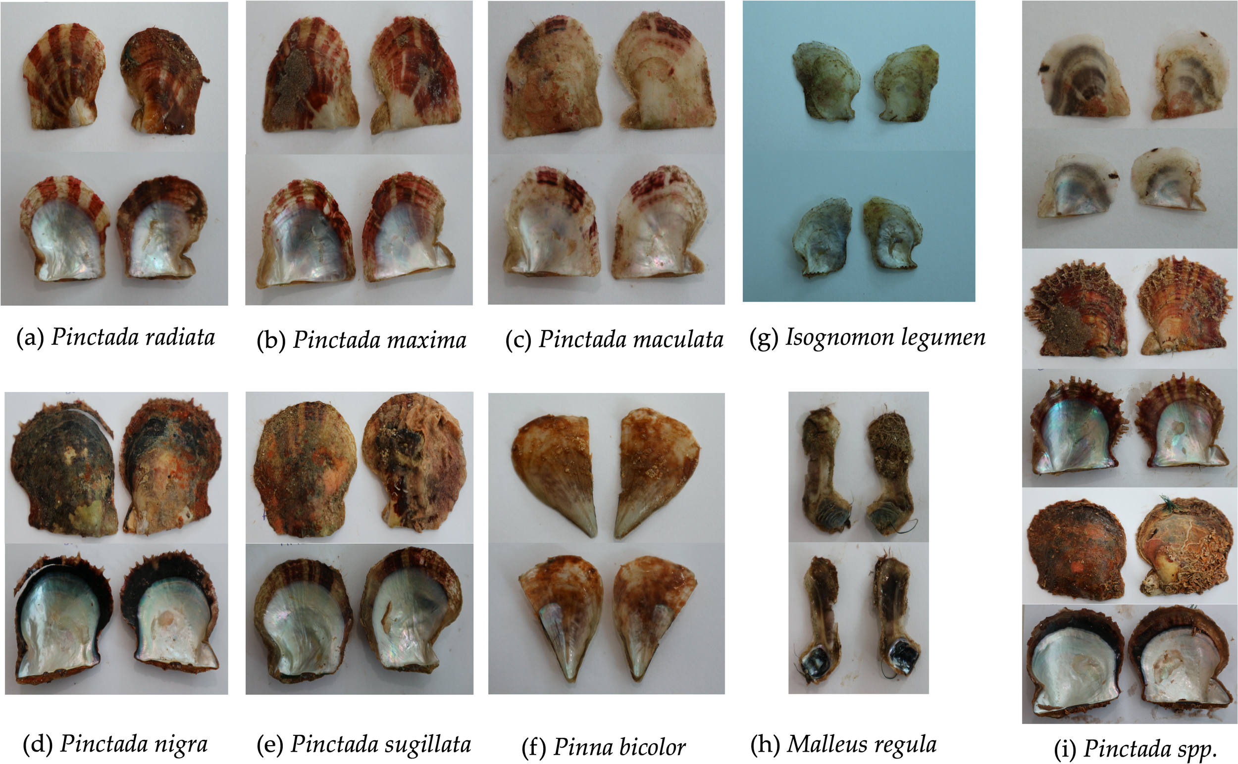 Figure 6. Specimens of pearl oysters recorded and grouped based on morphological characteristics in the Kingdom of Bahrain. Specimens include: (a) Pinctada radiata; (b) Pincatada maxima; (c) Pincatada maculata; (d) Pinctada nigra; (e) Pinctada sugillata; (f) Pinna bicolor; (g) Isognomon legumen; (h) Malleus regula; (i) Pincatada spp.