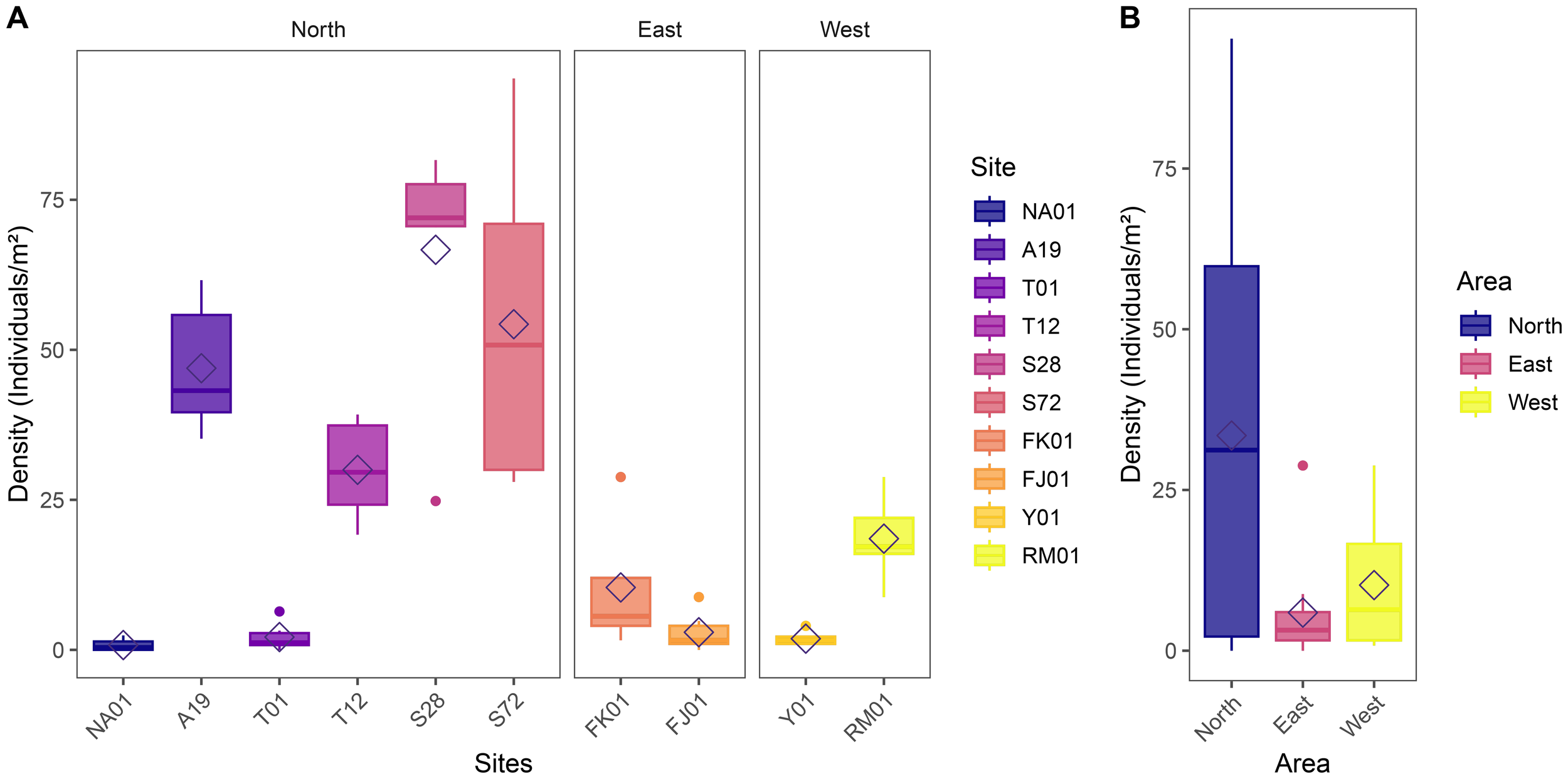 Densities varied across sites with higher densities observed in the south-west site of RM01 (mean = 19 ± 2.8 oysters/m2, N=6) and north-east site of FK01 (mean =10 ± 6.2 oysters/m2, N=4) while the opposite was observed in the north-west site (Y01: mean = 2 ± 0.5 oysters/m2, N=6) and south-east site (FJ01: mean = 3 ± 1.2 oysters/m2, N=6) which were recorded to have lower densities of oysters (Figure 7A).