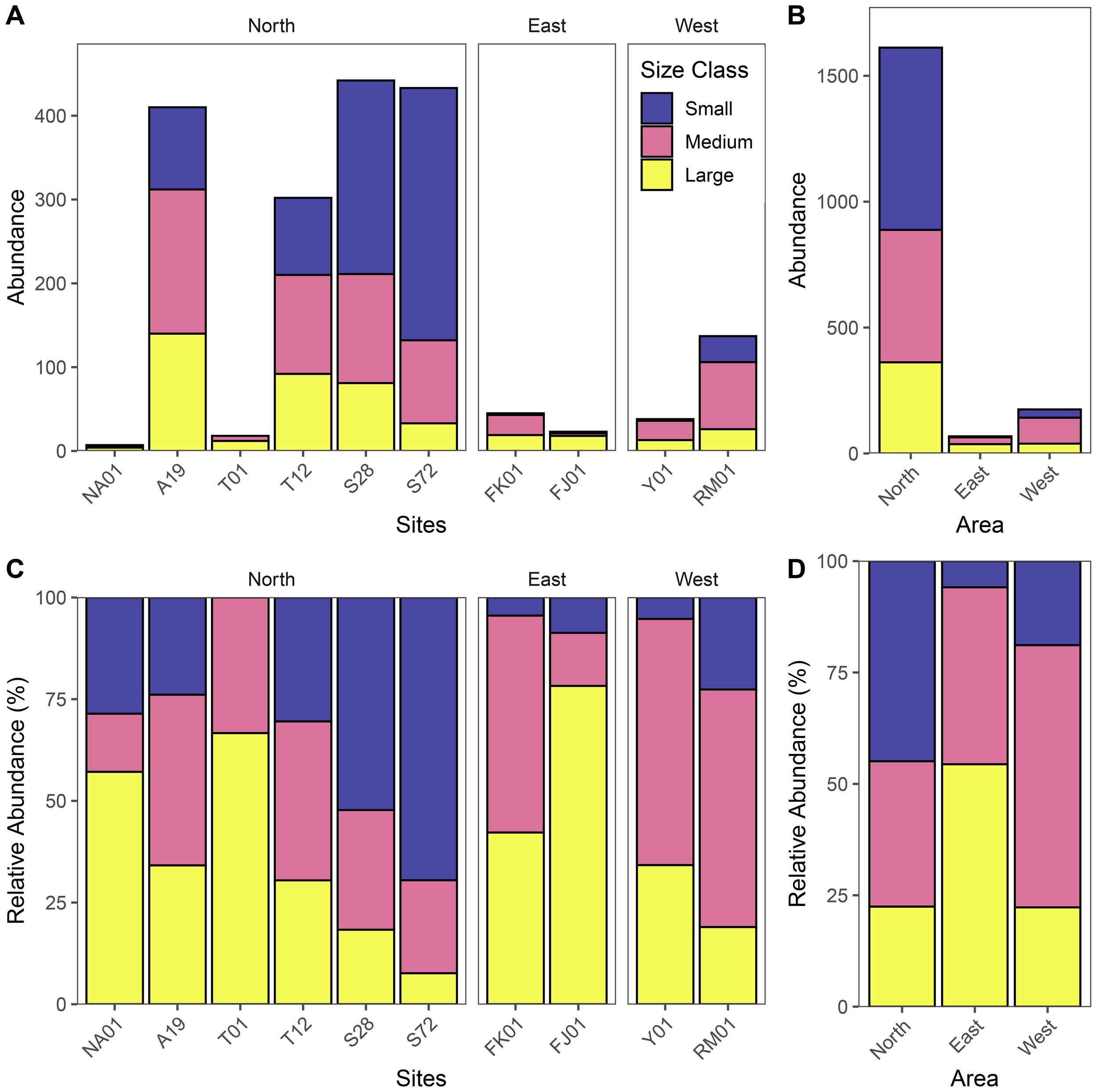 Figure 9. Size Class Composition of Oysters. Stacked bar plots showing (A, B) the absolute abundance and (C, D) the relative abundance (%) of oysters classified into size classes (Small, Medium, Large) across sampling sites (A, C) and areas (B, D) - Eastern Waters: FK01 (Falkland, Fasht Al Adhm) and FJ01 (Fasht Al Jabbari); Northern Waters are represented by sites: NA01 and A19 (Hayr Bu Amamah); T01 and T12 (Hayr Bul Thamah); S28 and S72 (Hayr Shtayyah); Western Waters: Y01 (Yassouf) and RM01 (Ras Al Mumtallah). These visualizations highlight spatial variation in oyster population structure based on shell size distribution.