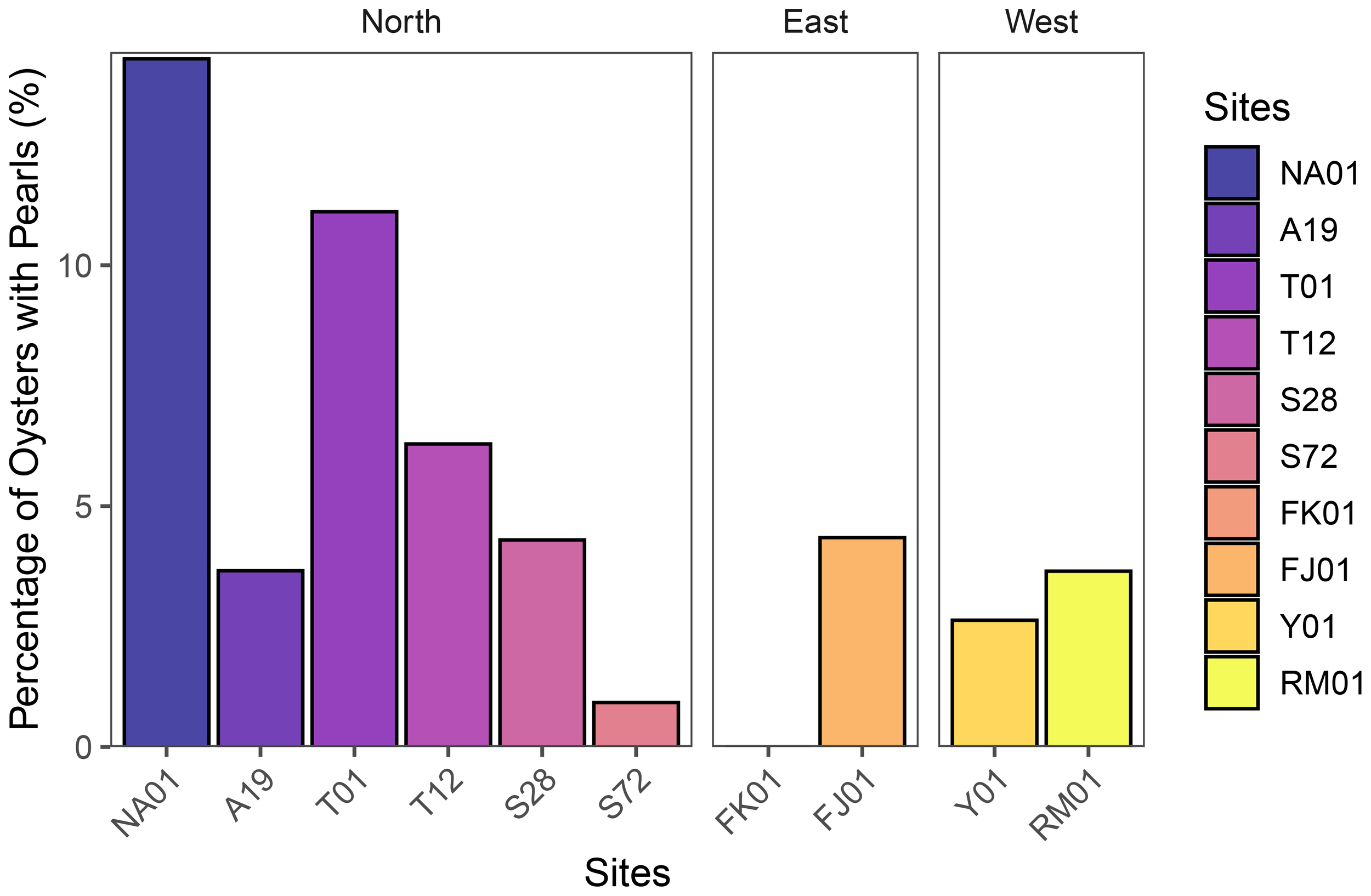Out of the 1,855 Pinctada spp. oysters collected from across the ten study sites in Bahrain, 3.6% [95% CI: 2.8–4.6%] of oysters had pearls in them. The proportion of oysters with pearls varied across sampling sites (Figure 10). The highest percentage of pearl presence was observed in Hayr Bu Amamah at site NA01 (14.3% [95% CI: 0.4–57.9%]) followed by Hayr Bul Thamah at site T01 (11.1% [95% CI: 1.4–34.7%]) and T12 (6.3% [95% CI: 3.8–9.7%]), while other sites such as FJ01, S28, A19, and RM01 exhibited moderate pearl yields ranging between 3.5% and 4.5%. In contrast, Y01, S72, and FK01 showed the lowest proportions, with FK01 recording no pearl incidence. These findings indicate variability in pearl occurrence across different oyster bed regions, with selected sites within the Northern Hayrat beds showing generally higher pearl percentages compared to the Eastern and Western beds. In addition, significant differences in the pearl yield across sites (χ² = 80.094, df = 9, p< 0.001), and areas (χ² = 96.608, df = 2, p< 0.001) were detected.