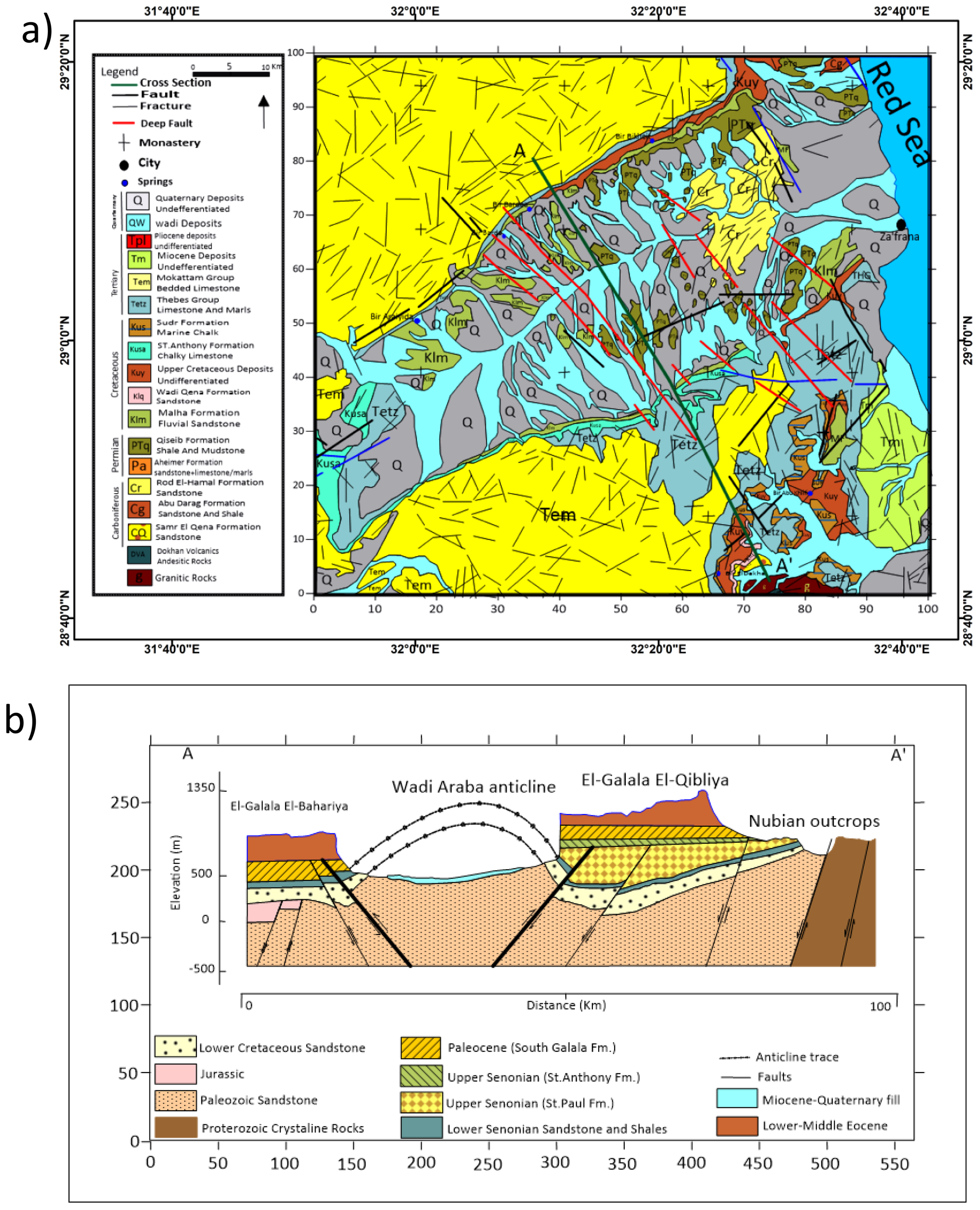 The Eastern Desertās central massifs, which include Wadi Araba, are geologically connected to the central Sinai massifs, from which they are separated by the Suez Gulf. This gulf represents a significant and elongated tectonic depression, reflecting the complex tectonic framework of the study area. This tectonic depression developed through several rifting phases in the Late OligoceneāMiocene, characterized by extensional faulting, block tilting (horsts and grabens), and strike-slip adjustments along transfer zones (Lyberis, 1988; Khalil and McClay, 2001).