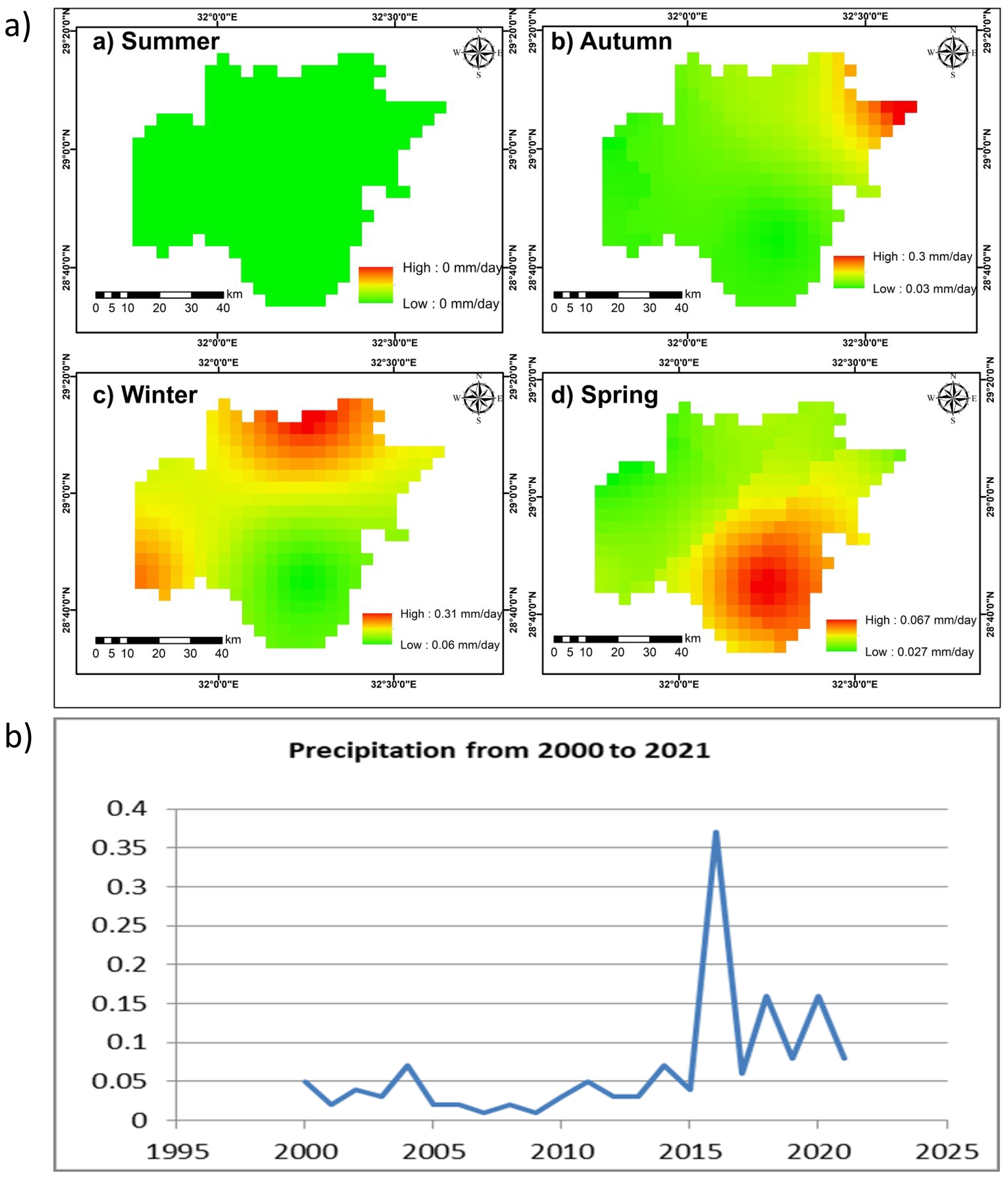 (a) Seasonal distribution of rainfall over Wadi Araba: (a) Summer, (b) Autumn, (c) Winter, and (d) Spring from 2000 to 2020. (Source: NASA/POWER CERES/MERRA2). (b) Annual precipitation trend from 2000 to 2021. Data source: CRU TS v4.07 dataset.