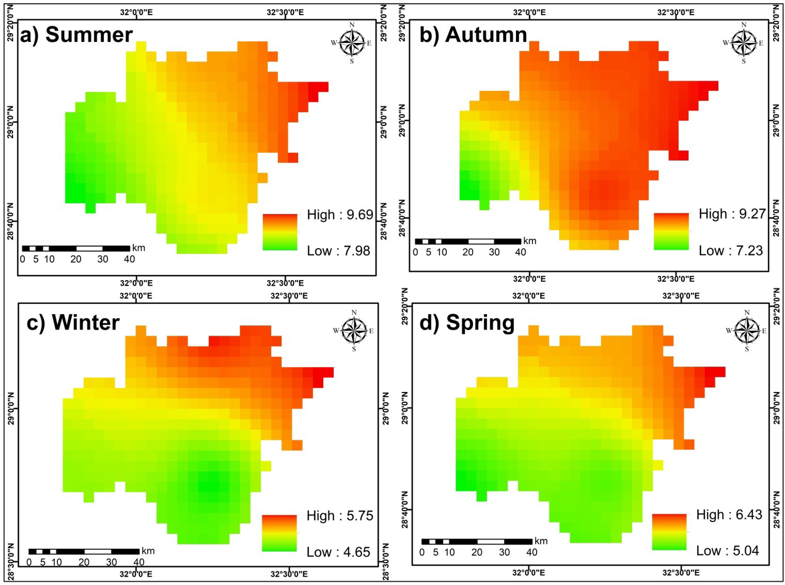 As illustrated in FigureĀ 4, the seasonal variation in specific humidity is evident. Summer recorded the highest specific humidity in the study area, ranging from a maximum of 9.69 g/kg to a minimum of 7.98 g/kg. Autumn followed with the second-highest specific humidity values, ranging from 9.27 g/kg to 7.23 g/kg. In spring, specific humidity ranged from 6.43 g/kg at its highest to 5.04 g/kg at its lowest values. Winter have the lowest specific humidity values with a maximum of 5.75 g/kg and a minimum of 4.65 g/kg.