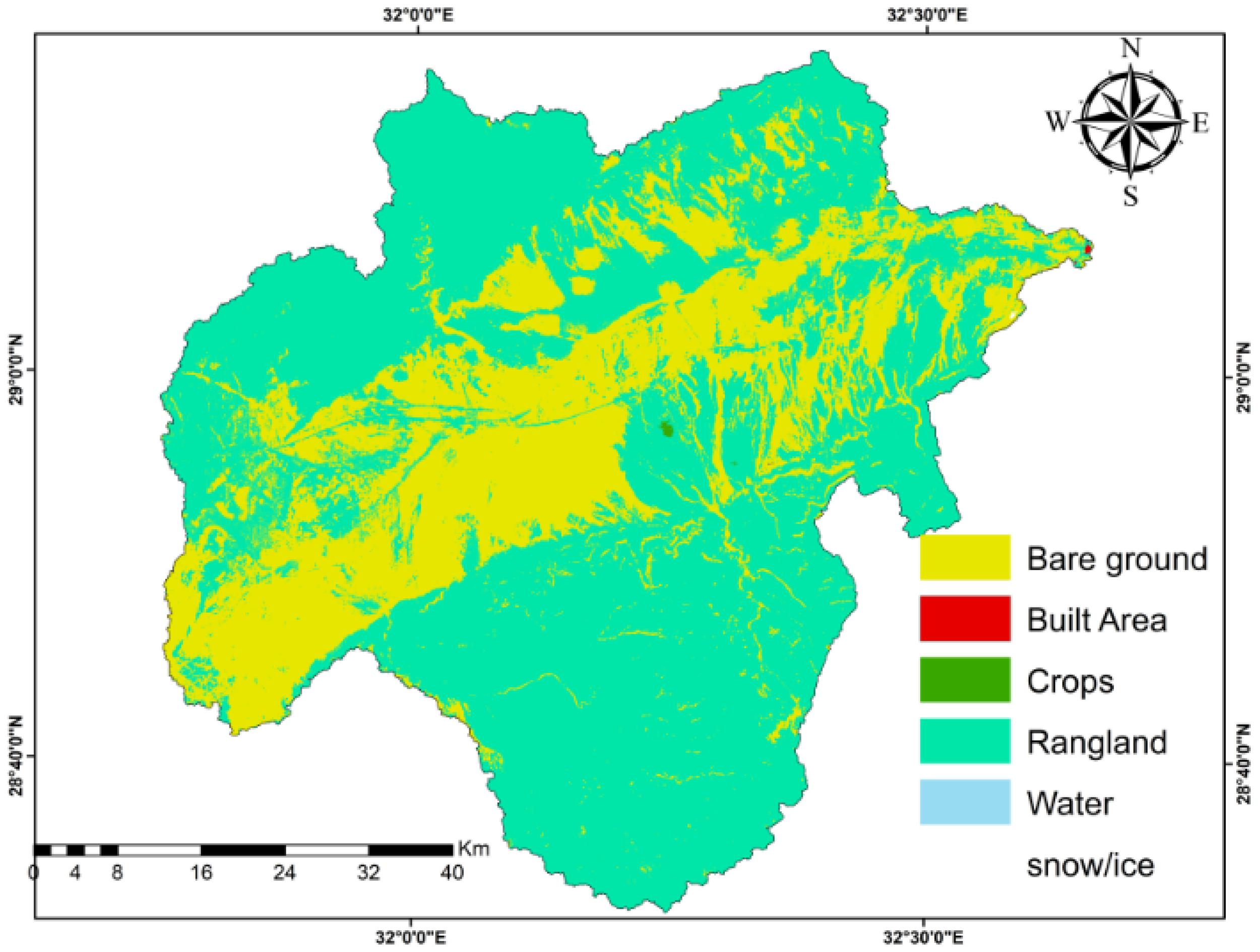 The study area includes five primary LULC classifications, covering areas of 1379.2 km² for bare lands, 0.56 km² for built up areas, 1.3 km² for crops, 2811.98 km² for rangland and 0.24 km² for water bodies. These classifications reflect the diversity of land cover types and their varying impacts on regional hydrology of any study area.