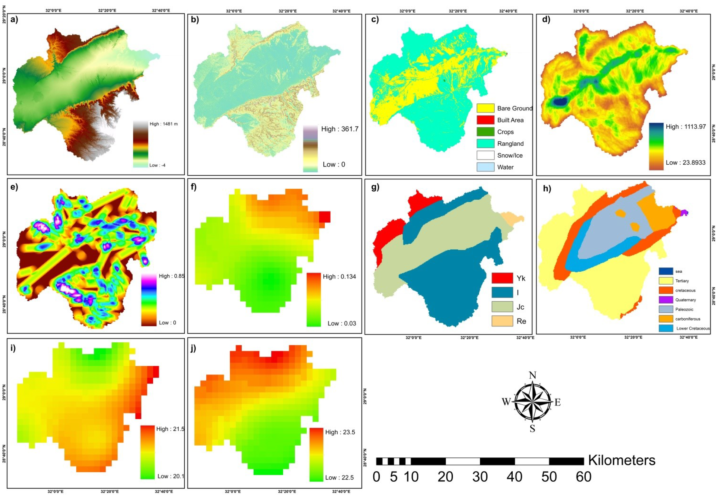 The elevation in the region ranges from -4 to 1481 meters, as shown in FigureĀ 6a. The Digital Elevation Model (DEM) is a foundational tool to estimate surface morphological characteristics, including slope, aspect, curvature, and drainage area. It also provides a robust basis for the three-dimensional representation and analysis of geographical data (Zhou and Liu, 2004).