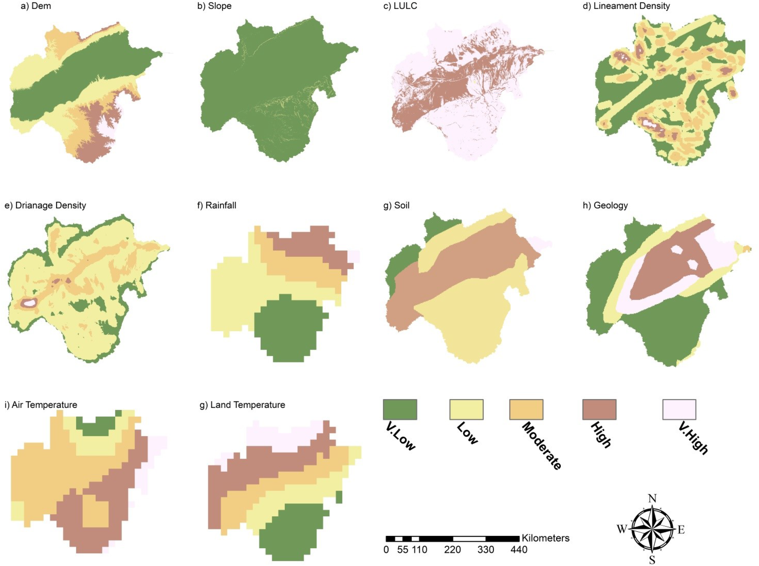 Several geospatial datasets were incorporated, including the Shuttle Radar Topography Mission (SRTM) Digital Elevation Model (DEM) for analyzing elevation, slope, and hillshade, as well as Esri Sentinel-2 Land cover Explorer platform (https://livingatlas.arcgis.com) for land use/land cover (LULC) mapping. Additional spatial layers included geological maps (lithological units), soil classifications, and climatic data such as precipitation, air temperature, and land surface temperature.