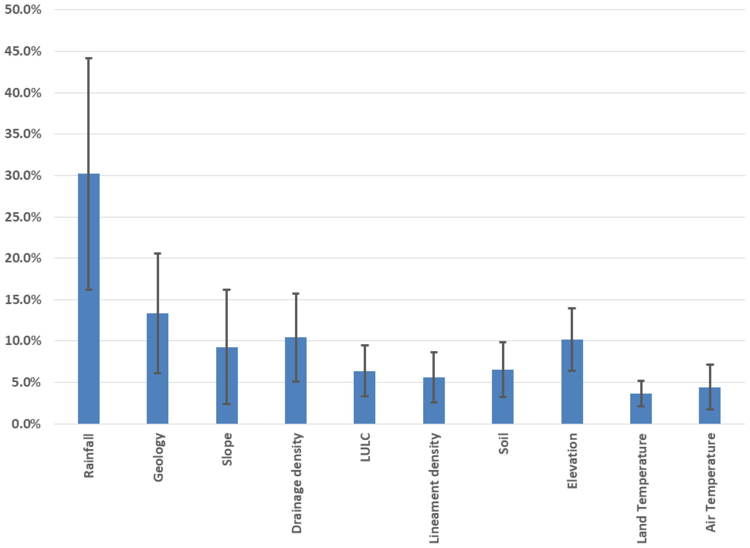 The slope aspect in FigureĀ 6b ranges from -1 to 359.9. Curvature, represented as the second derivatives of a given surface, often indicates the rate of change in the slope. Positive curvature values indicate an upward-inclined surface at the corresponding cell (FigureĀ 6c).