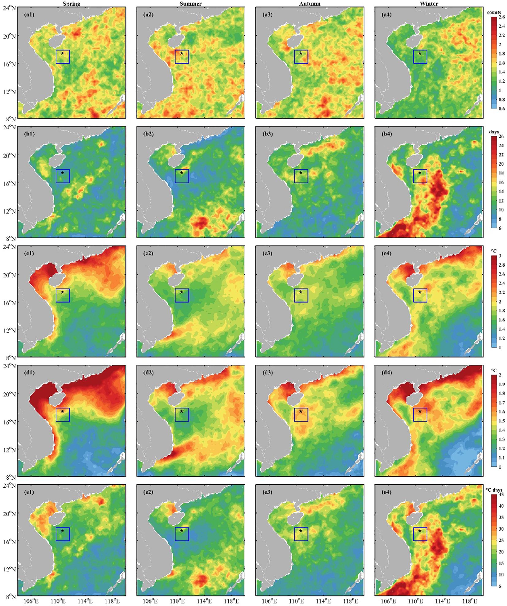 Figure 1. Spatial distribution of the multi-year four seasons of averaged MHW properties in the NSCS from 1982 to 2021. (a1)–(a4) Frequency, (b1)–(b4) duration, (c1)–(c4) maximum intensity, (d1)–(d4) mean intensity, and (e1)–(e4) cumulative intensity. The blue box, e.g., 16.0°N–17.9°N and 109.7°E, 111.7°E, is the region of interest in this paper. The subsurface mooring location (named M) is indicated by the black star in the blue box. MHW, marine heatwave; NSCS, Northern South China Sea.
