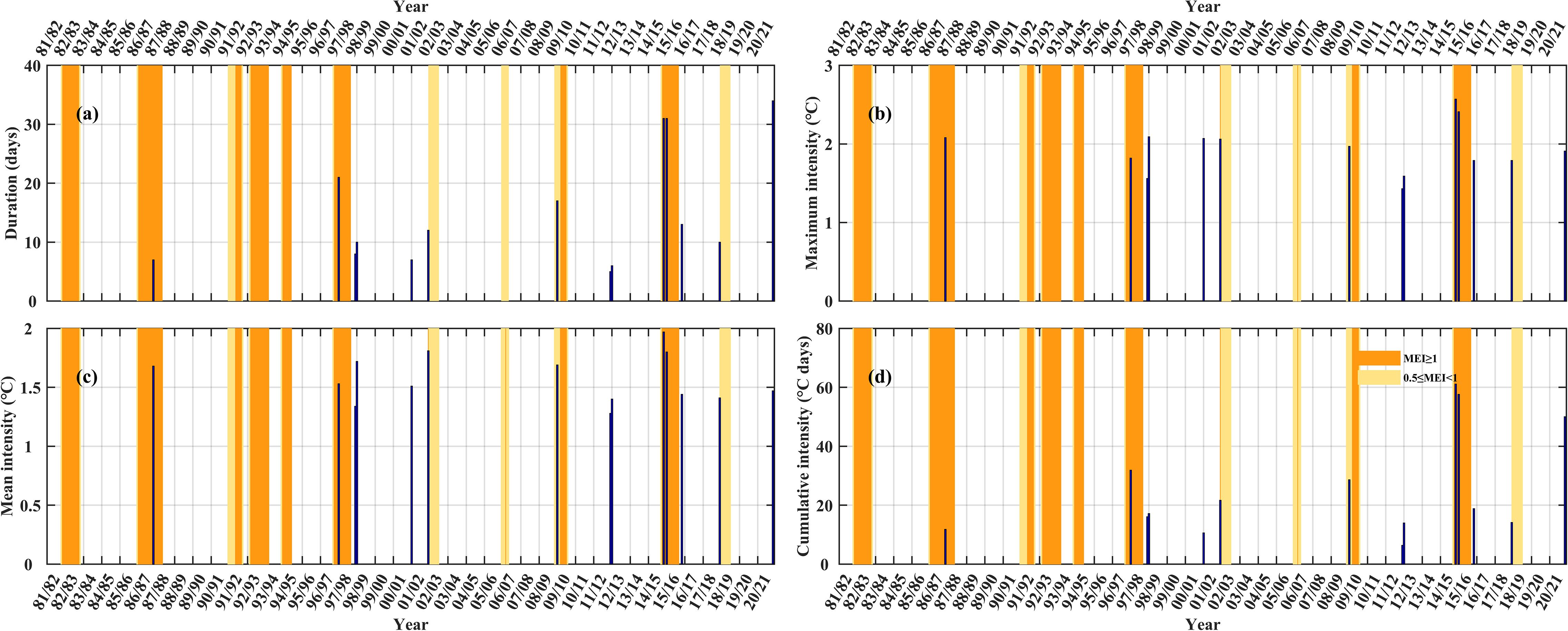 Figure 2. Statistical characteristics of winter MHWs in the blue box region of the NSCS during 1982−2021: (a) duration, (b) maximum intensity, (c) mean intensity, and (d) cumulative intensity. The yellow and orange bins indicate large and extreme positive MEI, respectively. More detailed information on the MHWs in the blue box region of NSCS can be seen in Table 1. MHW, marine heatwave; NSCS, Northern South China Sea; MEI, Multivariate El Niño-Southern Oscillation Index.