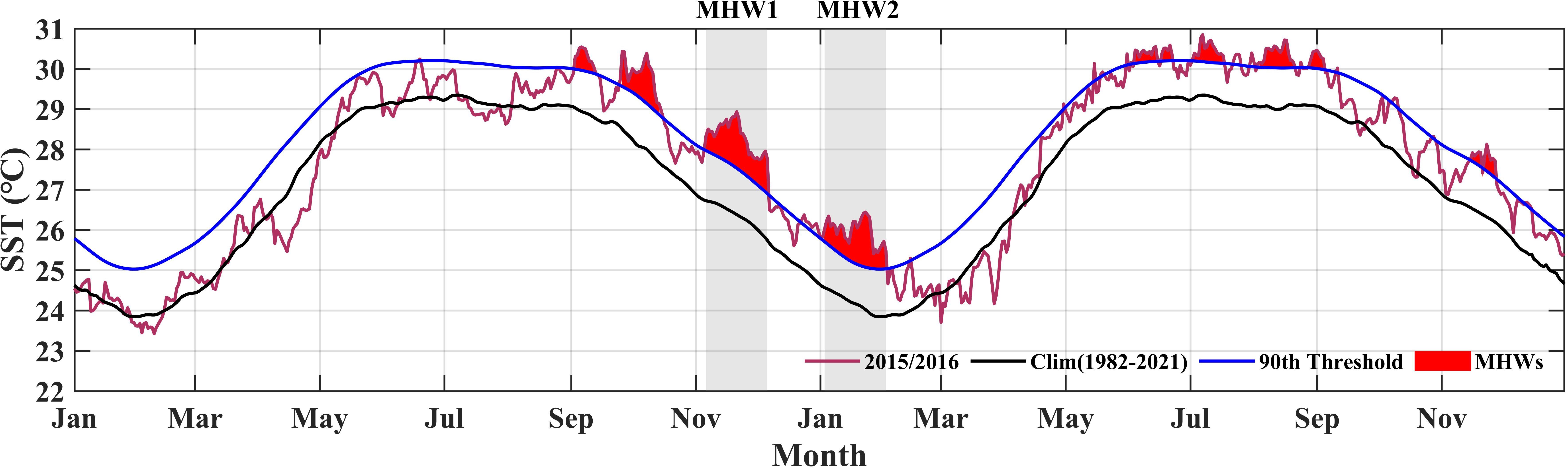Figure 3. Time series of averaged SST in the blue box region of the NSCS from January 2015 to December 2016. The red, blue, and black lines indicate the SST, the 90th percentile threshold, and the climatological SST, respectively. The red shading indicates the occurrence of MHWs, with the strongest MHW1 and MHW2 being marked in gray bins. SST, sea surface temperature; NSCS, Northern South China Sea; MHWs, marine heatwaves.
