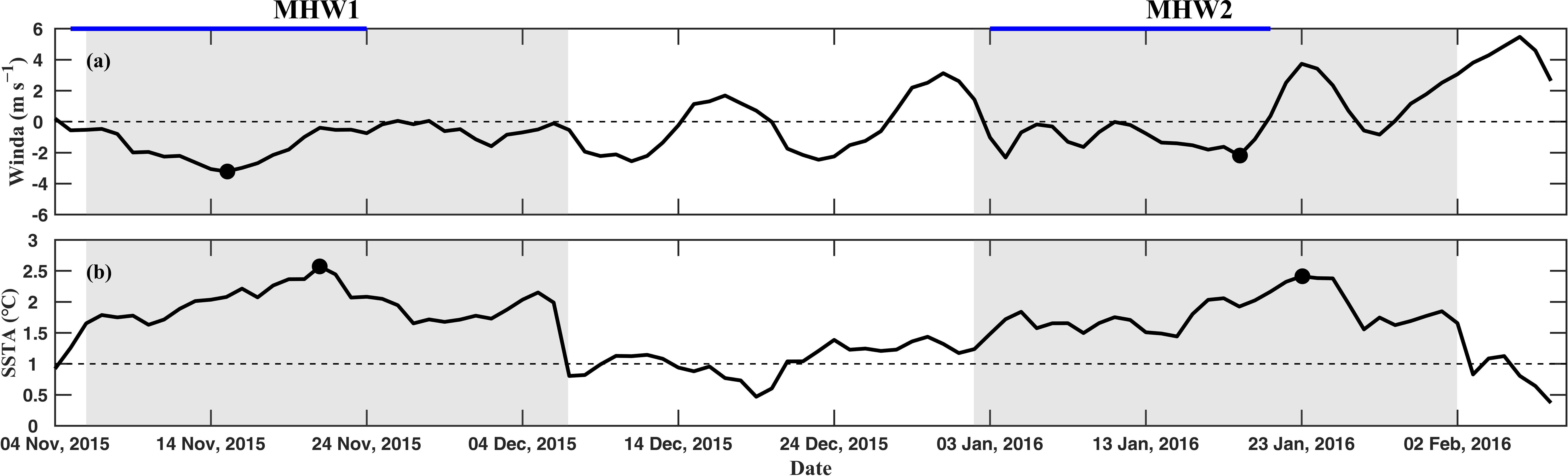 Figure 5. The time series of wind anomalies (a) and SSTA (b) for 4 November 2015–8 February 2016. The gray bars in (a) and (b) highlight the period for MHW1 and MHW2 events. The blue lines in (a) denote the period affected by wind. The dark circles represent respective maximum wind anomalies (a) and maximum SSTA (b). SSTA, sea surface temperature anomaly; MHW, marine heatwave.