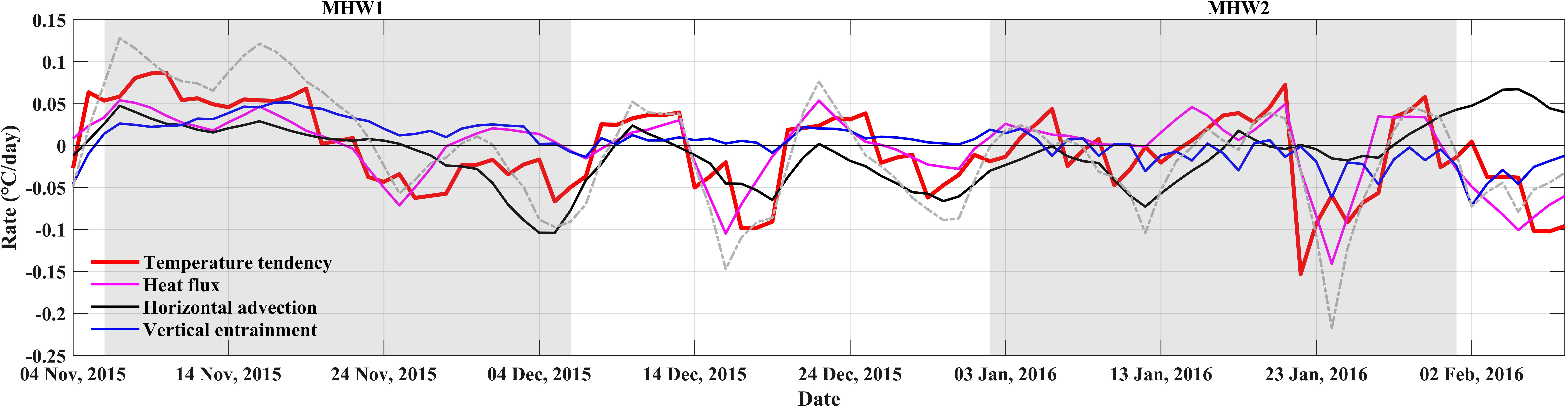 The atmospheric process (represented in the net heat flux term) and oceanic process (represented in the advection and entrainment terms) contributions were further quantified by applying the ocean mixed-layer heat budget analysis. Since September 2015, it has shown a significant rise in SSTAs in the blue box region (Figure 3). To reflect the previous SST rise, the mixed-layer heat budgets from September 2015 to February 2016 were taken relative to daily climatology (Figure 7). Positive anomalies in the temperature tendency term indicate a faster-than-climatology warming/slower-than-climatology cooling.