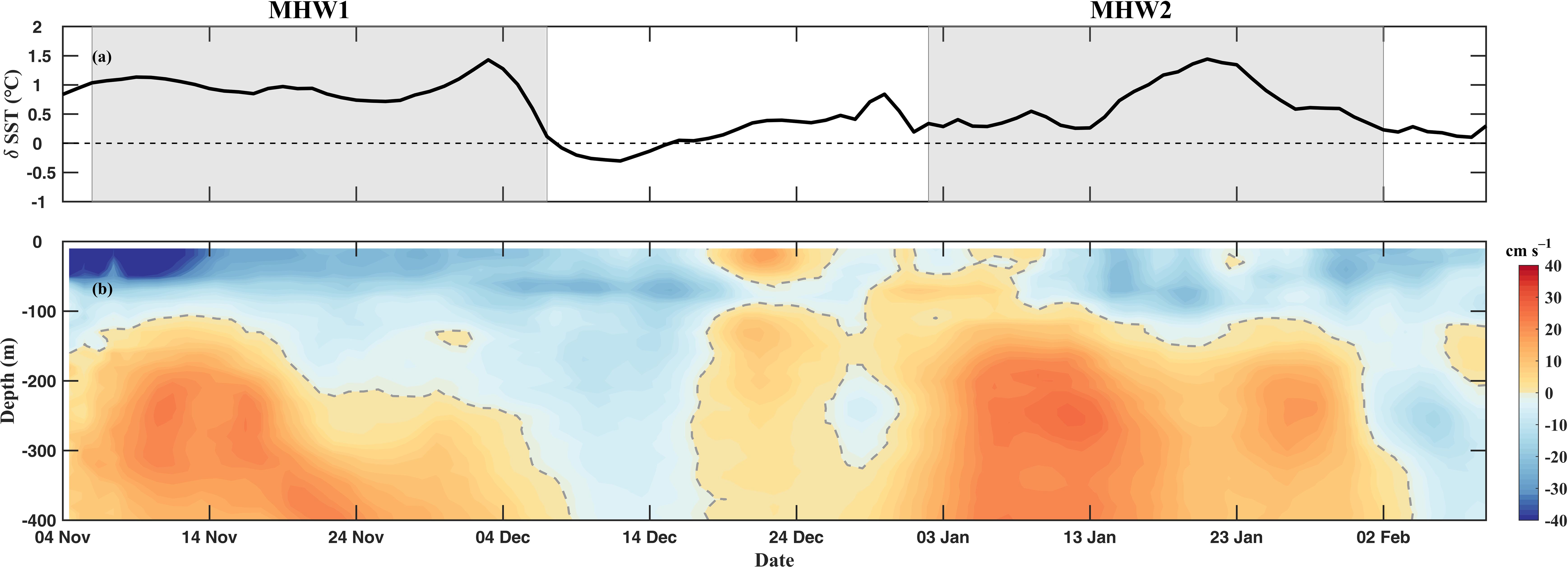 Figure 8. The time series of δSST (a) and δvelocity profiles (b) for 4 November 2015 (2016)–8 February 2016 (2017). The gray bars in (a) highlight the period for MHW1 and MHW2 events. The gray dashed line in (b) represents zero. MHW, marine heatwave.