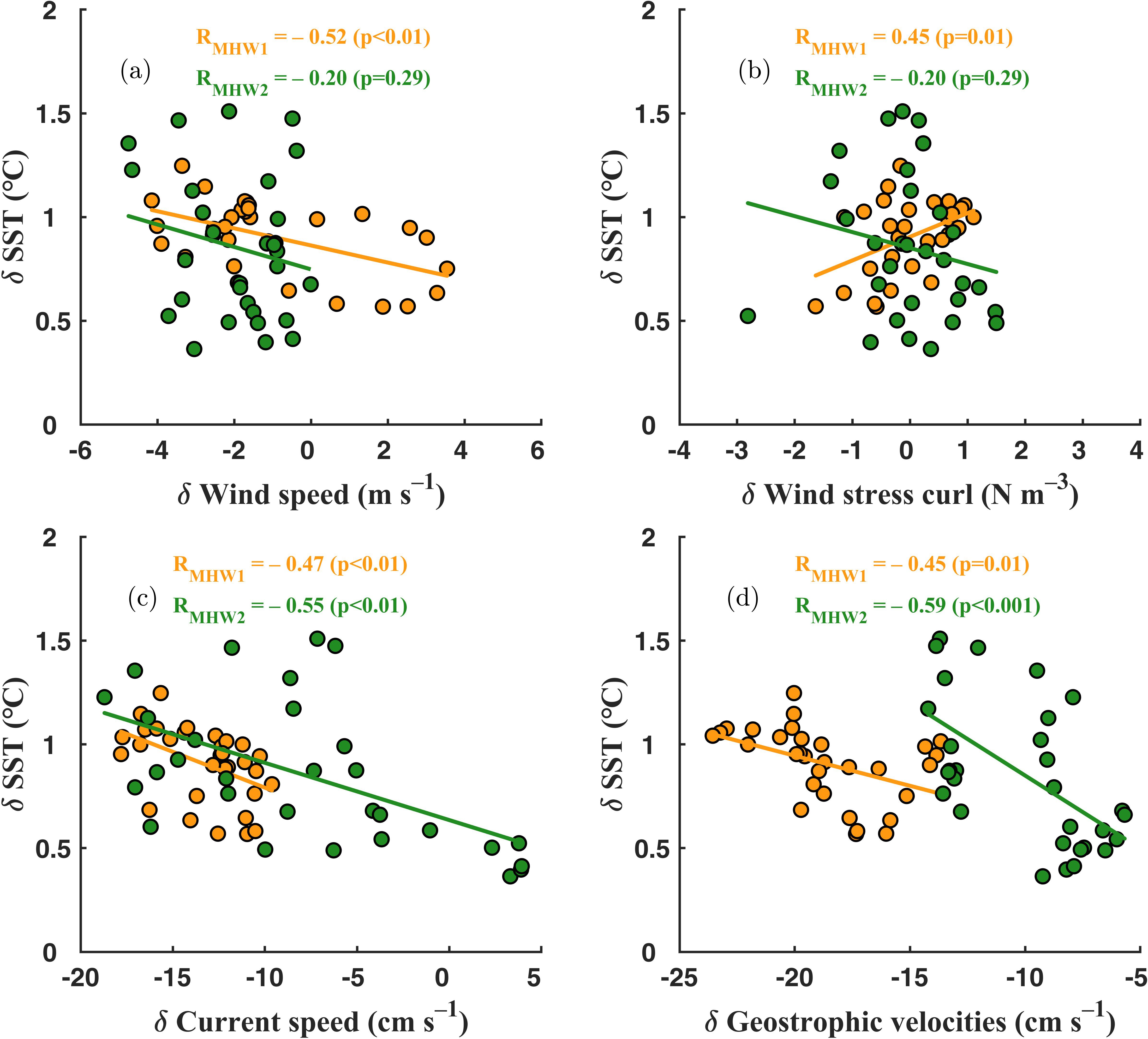 Figure 9. Relationships between δSST and δWind speed (a), between δSST and δWind curl (b), between δSST and δcurrent speed (c), and between δSST and δgeostrophic velocities (d) of the blue box in Figure 1. The orange dots (lines) and green dots (lines) in this figure represent the mean value in the domain during MHW1 and MHW2 periods, respectively. MHW, marine heatwave.