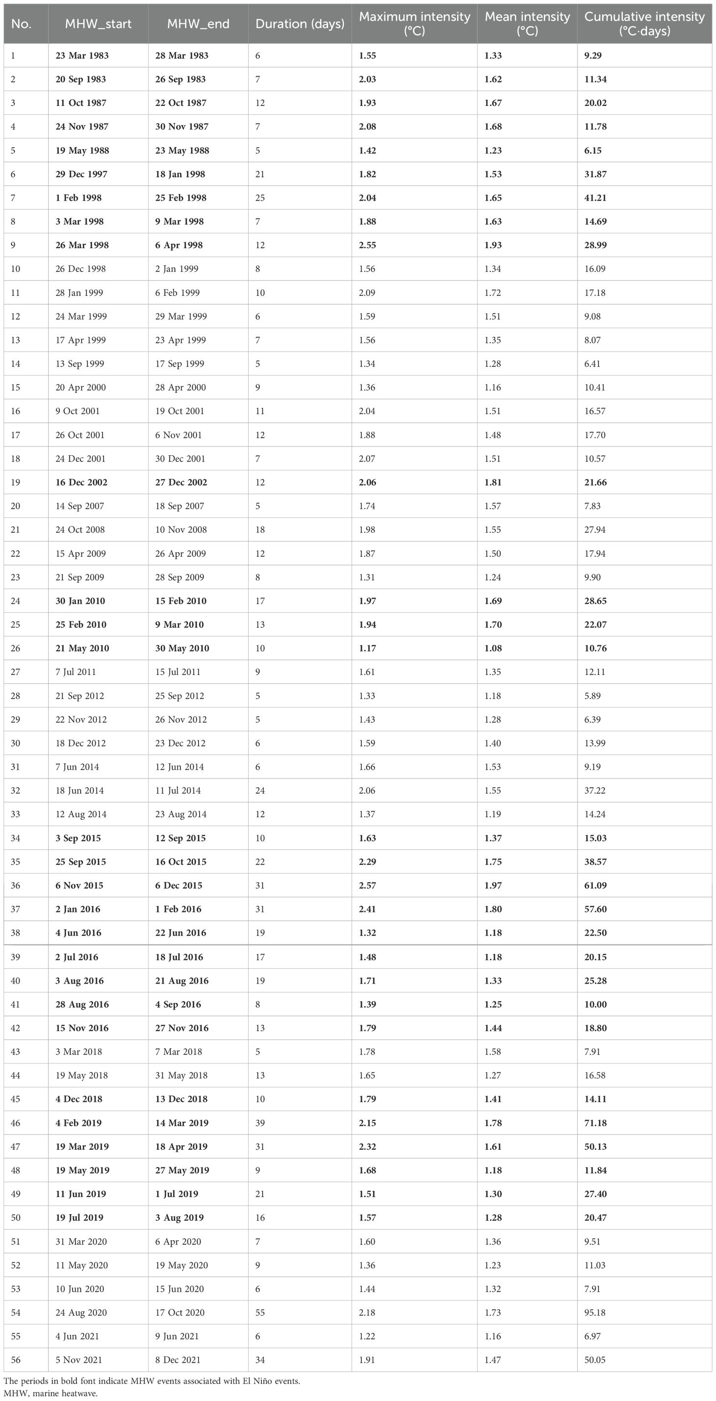 MHW events were defined as the daily SST at each grid point exceeding the 90th percentile at least five consecutive days within the climatology period 1982–2021, following Hobday et al. (2016). Two MHW events with an interval of less than 2 days were considered as a single MHW event. The climatological threshold and the mean were calculated from the daily SSTs within an 11-day window centered on each calendar day across all years and then smoothed using a 31-day moving average (Oliver et al., 2018). The 90th percentile is well-suited for studying impacts on marine ecosystems that are sensitive and accurate to identify MHW events (Li et al., 2019; Xiao et al., 2020; Yao and Wang, 2021; Feng et al., 2022; Liu et al., 2022; Mo et al., 2022; Tan et al., 2022; Wang et al., 2022b; Yao et al., 2022; Han et al., 2023; He et al., 2023; Song et al., 2023; Zhao et al., 2023). Once MHWs were identified, a set of metrics, including frequency, duration, total days, mean intensity, maximum intensity, and cumulative intensity, was calculated. Frequency (unit: counts) means the number of MHW events. Duration (unit: days) represents the time between the start and end dates of an MHW event. Total days (unit: days) is the sum of MHW days. Mean intensity (unit: °C), maximum intensity (unit: °C), and cumulative intensity (unit: °C·days) were calculated as the mean temperature anomaly, maximum temperature anomaly, and the sum of the temperature anomalies during an MHW event, respectively. If one MHW event spans multiple months or years, the start date of this event was consistently used as the statistical criterion (Oliver et al., 2018; Lyu et al., 2024).