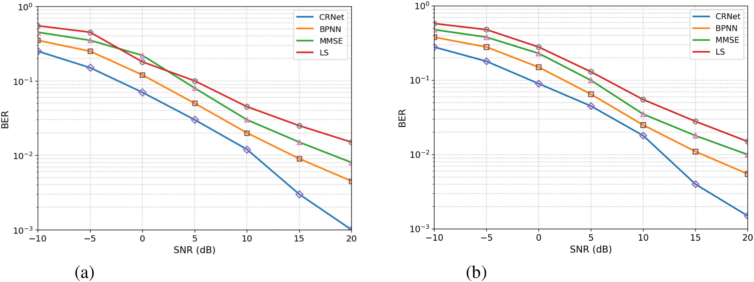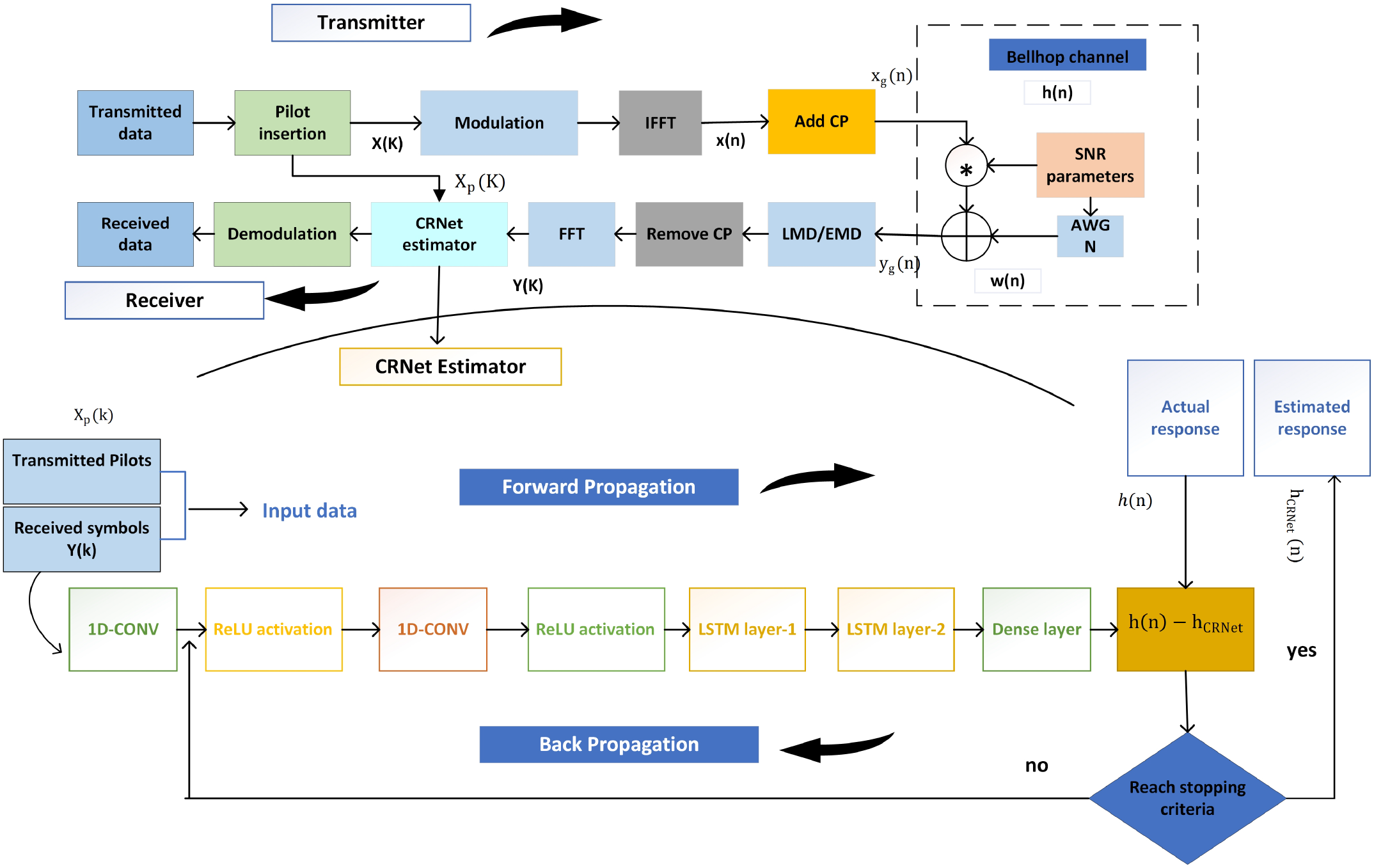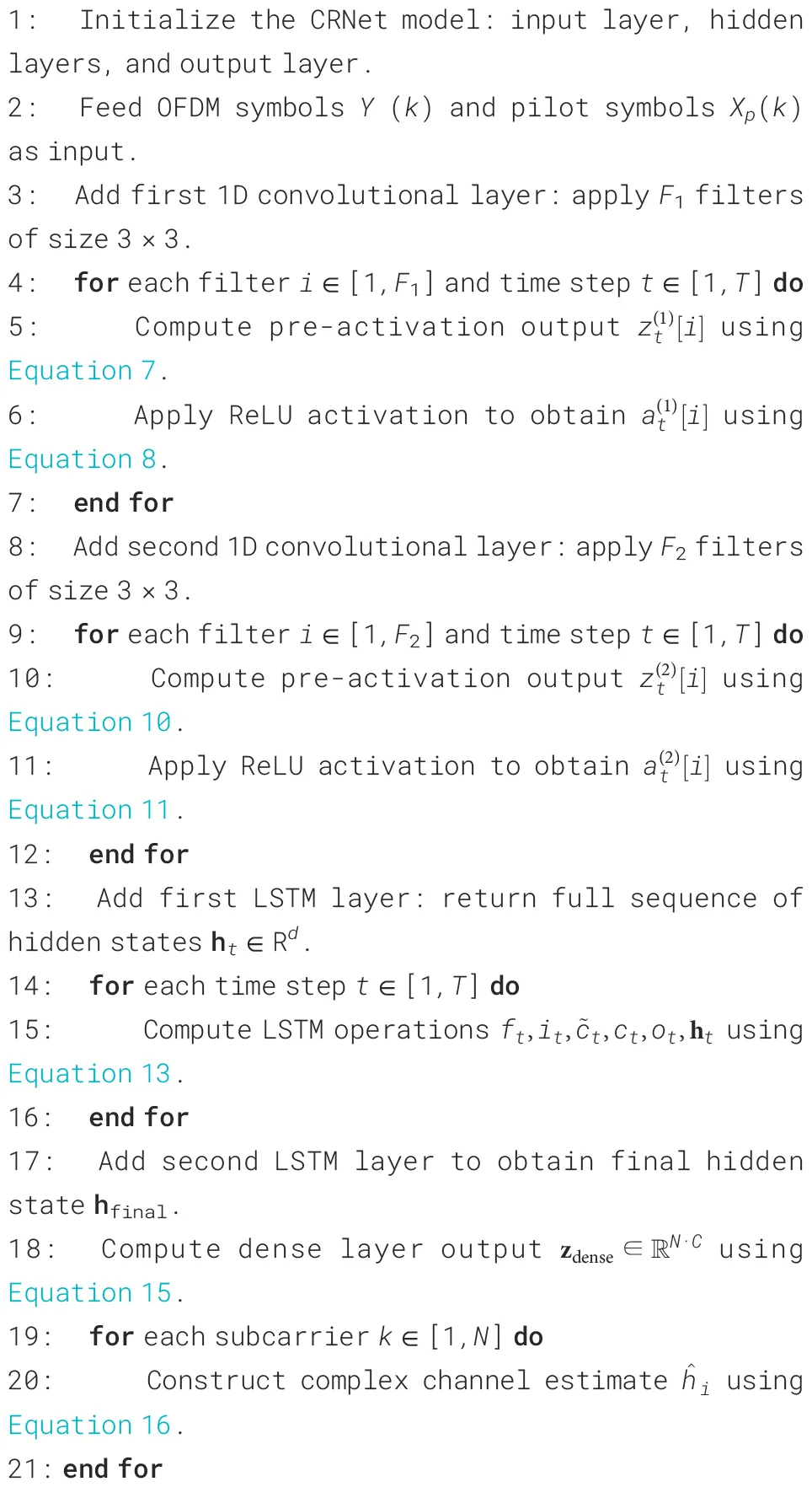 The CRNet model is trained using a supervised learning approach, where each training instance consists of an input-output pair. The input includes both the received OFDM signals and their corresponding pilot symbols, while the output represents the true channel characteristics. During training, the model iteratively updates its internal parameters such as weights and biases to accurately map the input data to the desired channel responses. The overall functionality and processing pipeline of the CRNet framework are illustrated in Figure 1 and formally described in Algorithm 1 for clarity and reproducibility.
