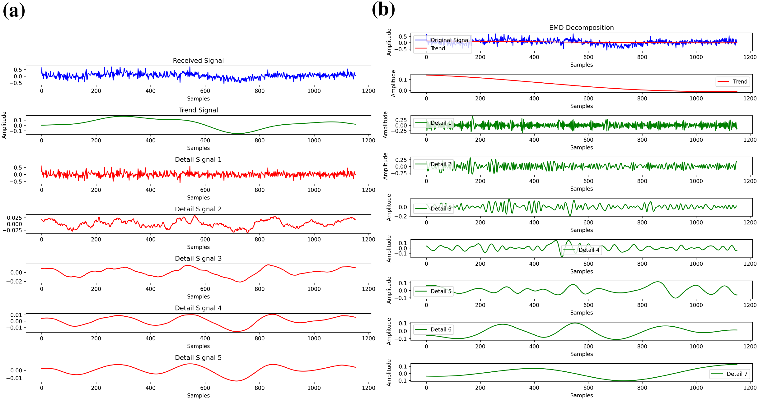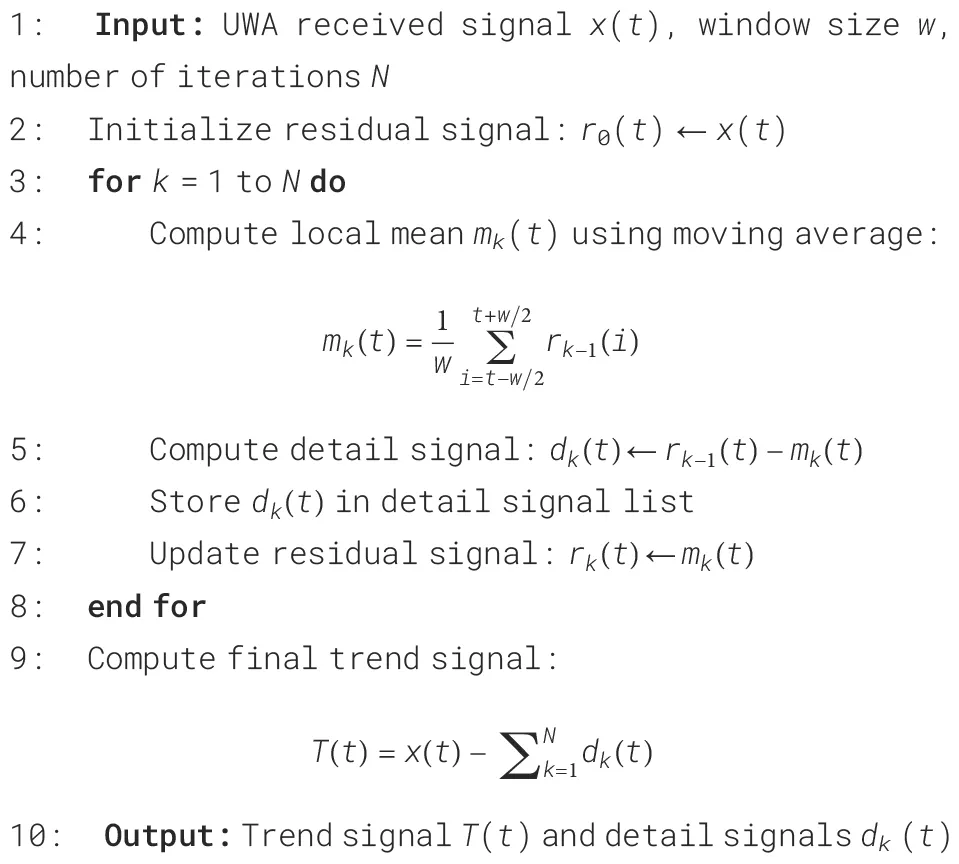 Various denoising techniques have been proposed in recent literature to enhance the quality of UWA signals, which are often degraded by non-stationary and nonlinear noise sources such as wind, marine life, and ship machinery. EMD combined with frequency-domain thresholding has been shown effective in isolating intrinsic mode functions (IMFs) and reducing ambient noise in Veeraiyan et al. (2013). Advanced approaches integrate signal decomposition with machine learning models for instance, Correlation-based Variational Mode Decomposition (CVMD) coupled with Least Squares Support Vector Machine (LSSVM) and Gaussian Process Regression (GPR) improves prediction and denoising by adaptively selecting decomposition parameters as proposed in Yang et al. (2020a). Additionally, in Yang et al. (2020b) a hybrid framework like MIVMD-mvMDE-LWTD-SG leverages mutual information-based VMD multiscale entropy, and wavelet-based filtering was proposed to handle complex, chaotic, and ship-radiated noise components more effectively.