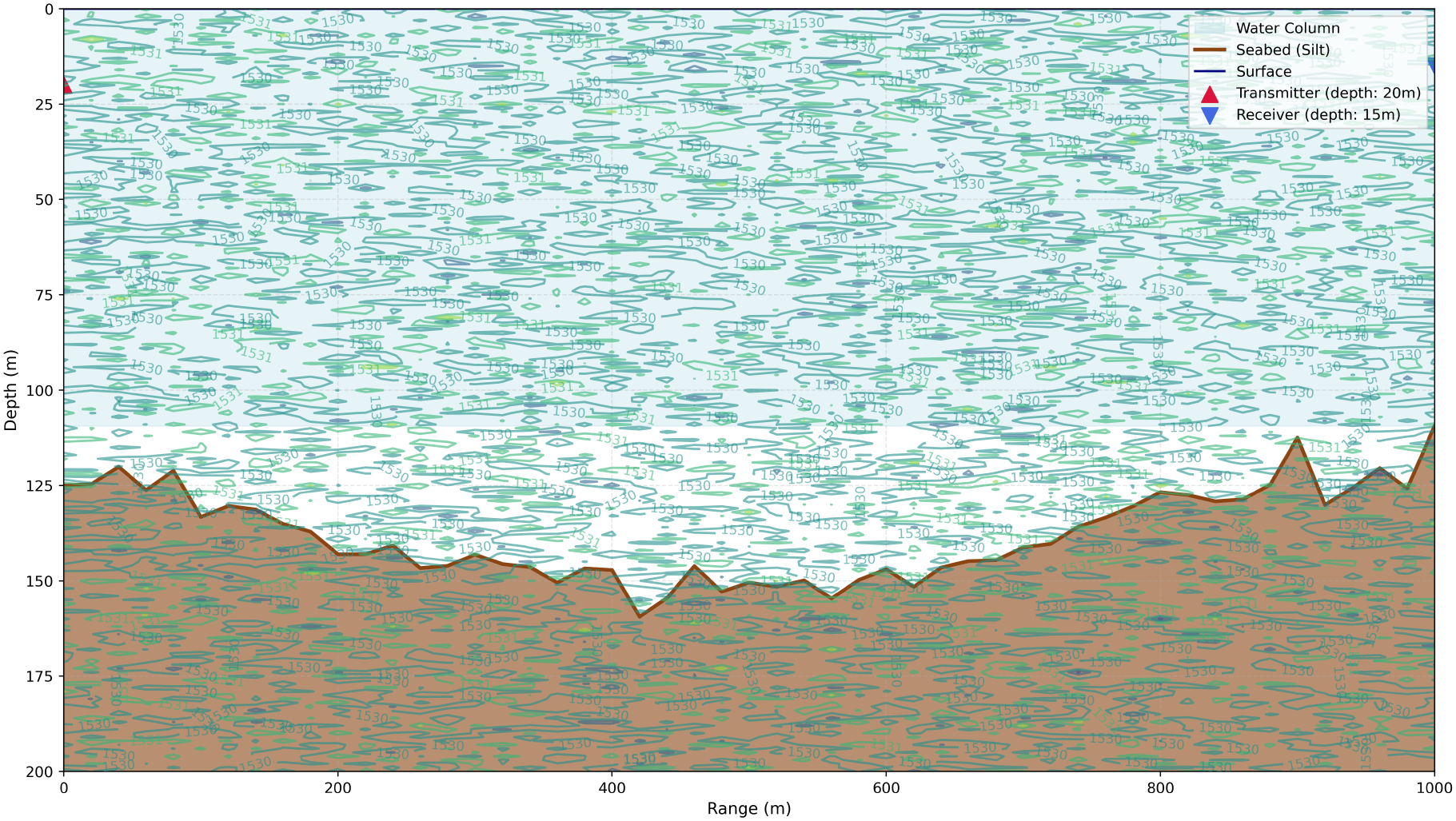 To accurately represent the spatial variability present in real marine environments, the Bellhop model is further adjusted to simulate both horizontal and vertical gradients in environmental characteristics: vertical sound speed profiles (SSPs) integrate depth dependent temperature gradients (5–25 °C) and salinity levels (30–35 ppt), with shallow coastal areas displaying a surface duct (an increase in sound speed with depth up to 10m) and Continental shelf conditions characterized by a sound channel (minimum sound speed at depths of 50–100 m); the seabed is depicted as a spatially heterogeneous medium, with transitions between sand (near shore) and silt (continental shelves) occurring at random horizontal intervals (50–200 m); horizontal ambient noise gradients also fluctuate, with near shore regions incorporating ship noise contributions (10–20 dB higher at 1–5 kHz) continental shelf areas mainly influenced by both marine life noise and ships (peaking at 10–100 Hz). These modifications ensure the model capacity to generalize across diverse underwater scenarios, reflecting the dynamic attributes of the aquatic environment.