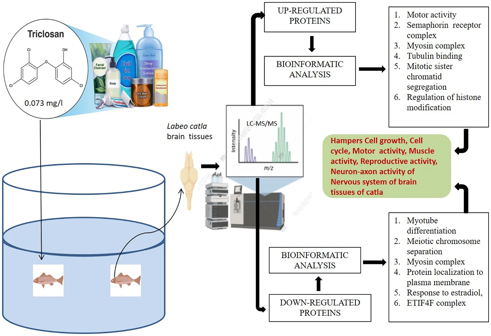 To obtain detailed information about the effects of TCS and the mode of operation in the brain tissues of Catla, we used a modern proteomic approach with detailed analysis by advanced bioinformatics tools. Proteomic data related to TCS-treated fish brain tissues are very limited. To obtain elaborate and comprehensive data related to the mode of action of TCS and its toxicity in the brain tissues of Catla, we used label-free proteomics and advanced bioinformatics analysis. To our knowledge, this is the first study applying label-free proteomics to evaluate TCS effects on the brain tissues of the commercially important carp L. catla. Recent studies have further highlighted the ecotoxicological relevance of TCS (Sharma et al., 2022a, Sharma et al., 2022b; Dar et al., 2024, Dar et al., 2025), reinforcing the need to investigate its molecular impacts in food fish species.