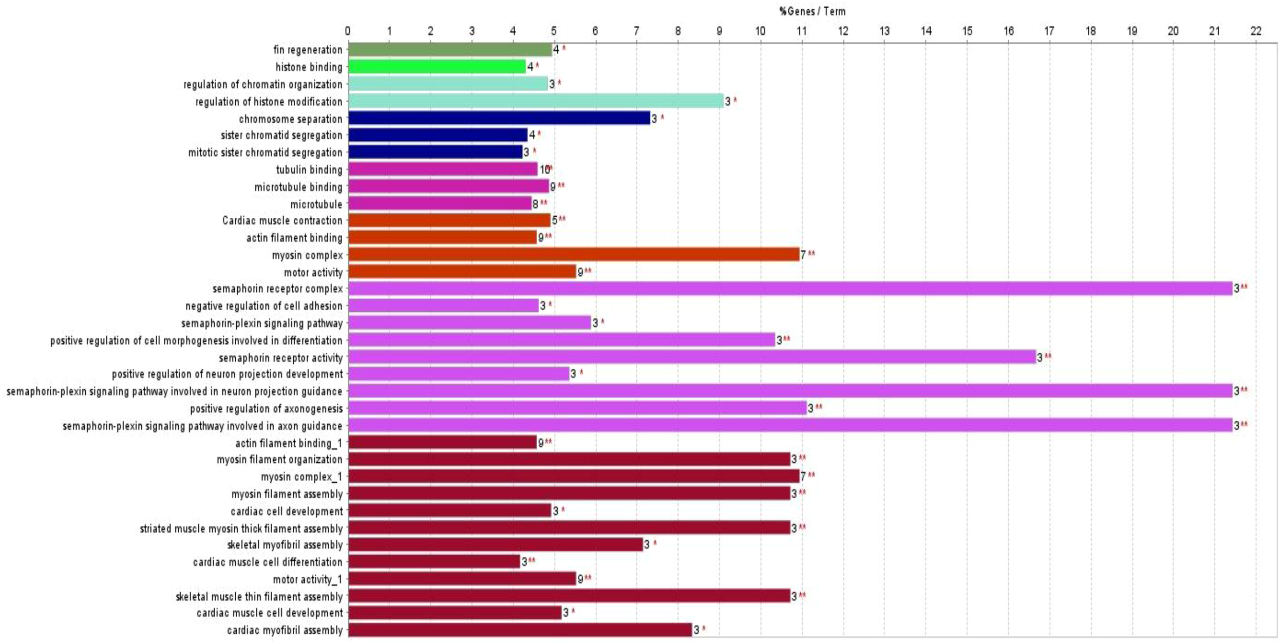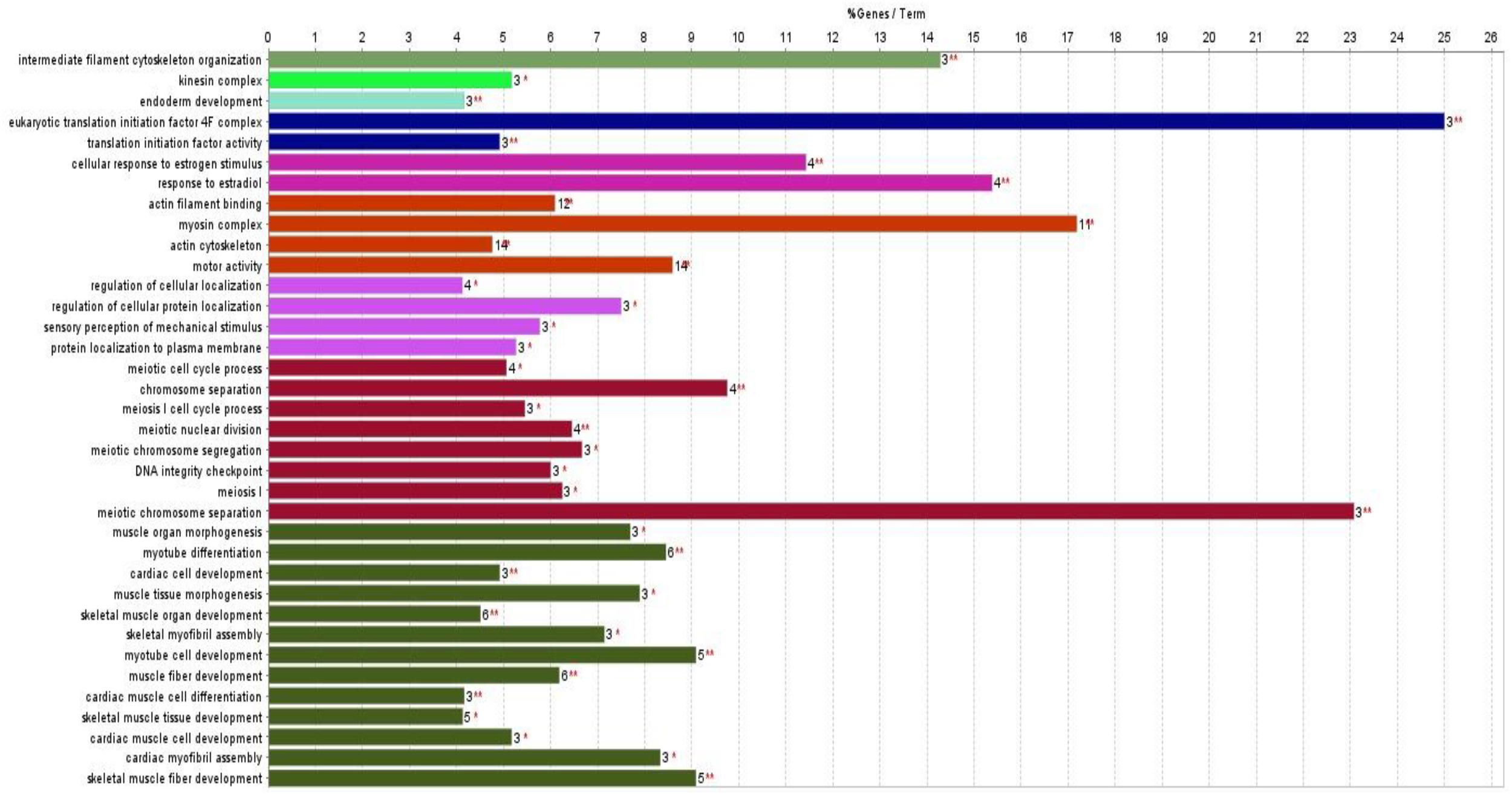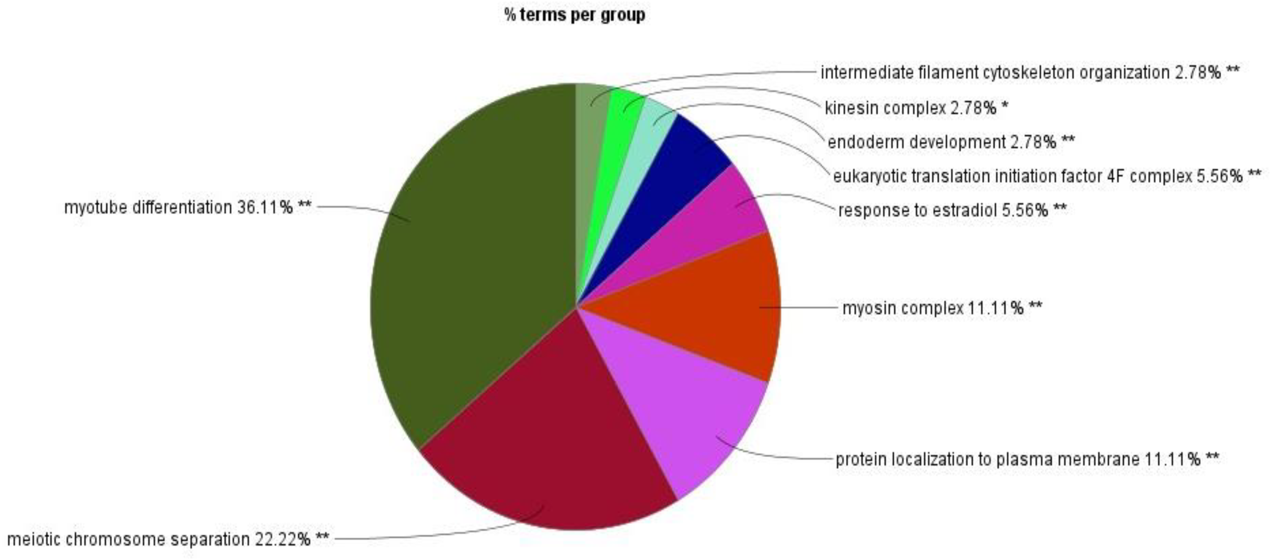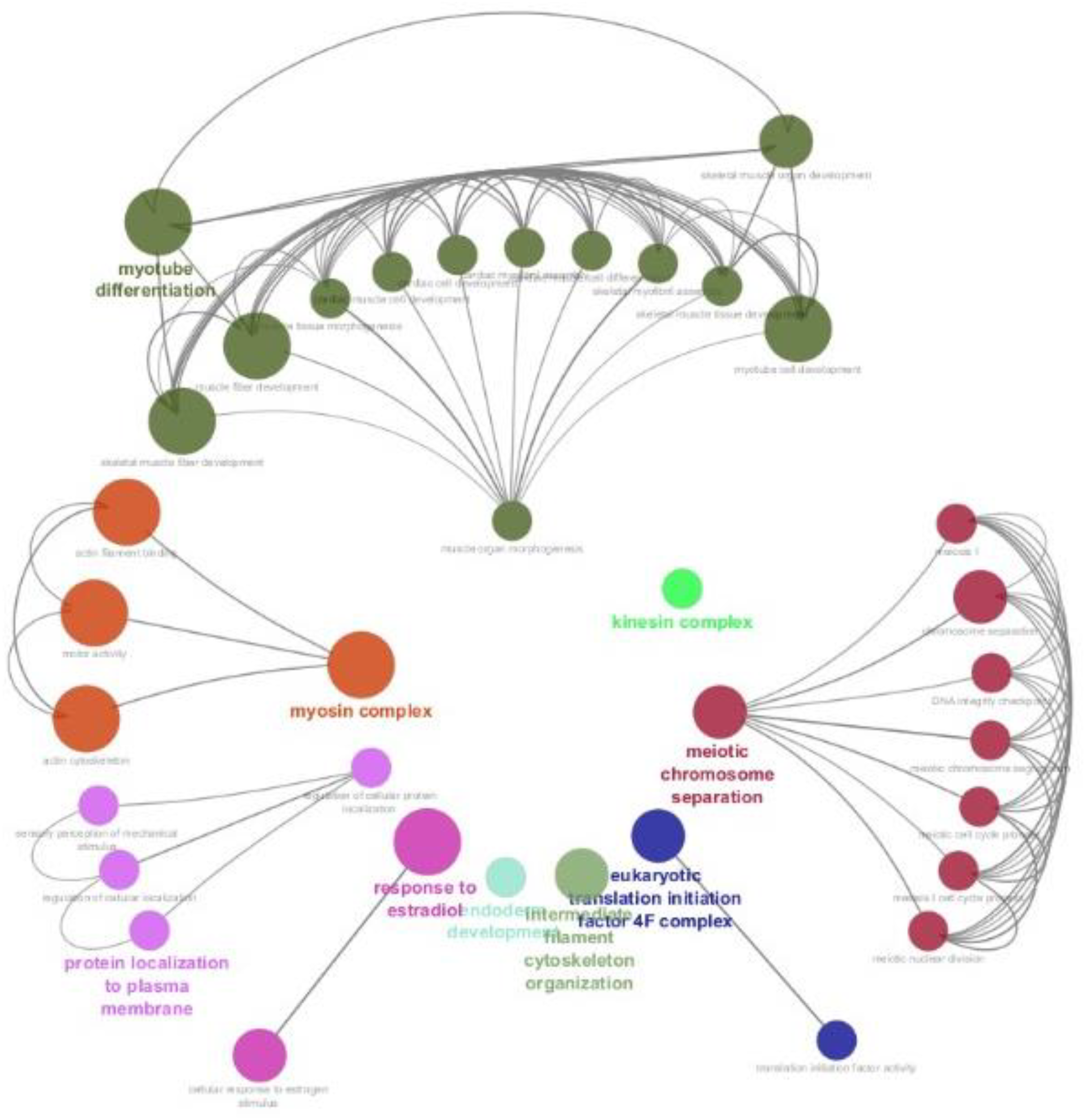 In protein–protein interaction network analysis, we found that most of the proteins were associated with two main GO categories, “muscle organ morphogenesis” and “meiotic chromosome separation” terms, which were interconnected to a maximum number of other related biological processes (Figure 6). The muscle organ morphogenesis was associated with twelve other terms related to biological processes or terms, and meiotic chromosome separation was associated with seven other terms related to biological processes or terms. The downregulated proteins in kinesin complex, intermediate filament cytoskeleton organizations, and endoderm development terms did not show any association with any other group of proteins or terms.