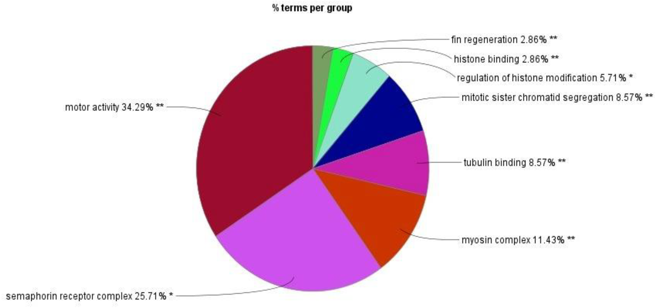 GO enrichment analysis identified 23 biological processes, four cellular components, and seven molecular functions significantly upregulated by TCS treatment (False Discovery Rate (FDR) < 0.05) due to triclosan treatment of L. catla brain tissues (Figure 1). The maximum number of identified upregulated proteins induced by TCS treatment in the biological processes was four. The proteins are related to the fin regeneration process (proteins: chd4a, hspa9, inhbaa, and ttk) and sister chromatid segregation processes (proteins: ncapd3, pds5b, smc3, and top2b). The microtubule cellular components possess the highest number of eight (camsap1b, cep162, ckap5, clasp1a, gas8, kif13bb, kif15, and map4l) upregulated proteins. Out of seven molecular functions, tubulin binding had the maximum number of upregulated proteins, and the 10 upregulated proteins were agtpbp1, camsap1b, ccdc88c, ckap5, clasp1a, gas8, kif13bb, kif15, macf1b, and map4l. Although among the upregulated proteins the maximum proportion of proteins was related to the motor activity (34.29%) term, semaphorin receptor complex (25.71%) term, and myosin complex (11.43%) term (Figure 2), in upregulated proteins, kinesin-like protein (kif13bb), microtubule-associated protein (map41), CLIP-associated protein (clasp1a), sister chromatid cohesion proteins (pds5b), cytoskeleton-associated protein (ckap5), calmodulin-regulated spectrin-associated protein (camsap1b), and plexin proteins (plexinb1 and plexinc1) were well overexpressed in Catla brain due to TCS exposure.