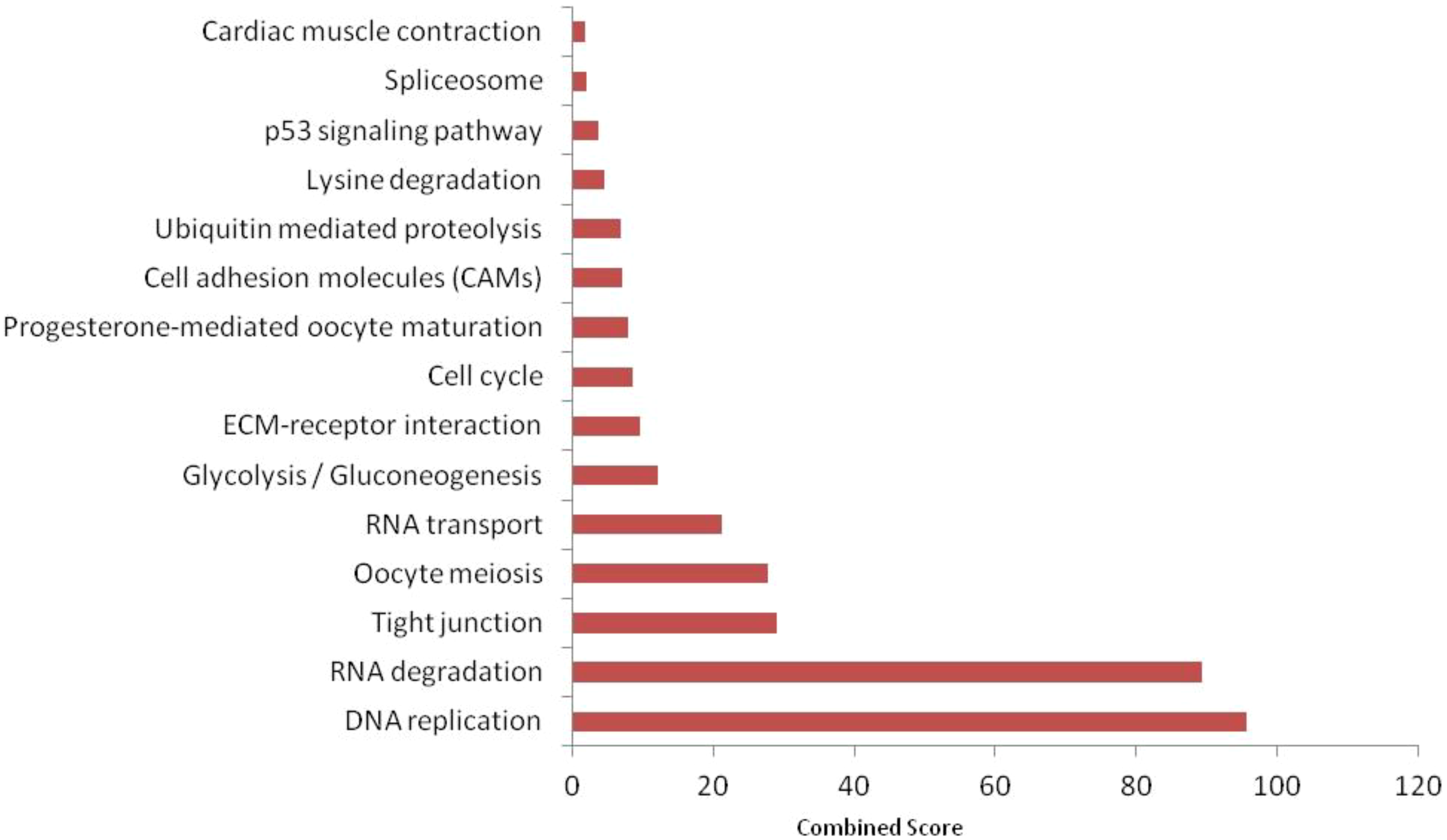 Top 15 KEGG pathways enriched in significantly downregulated proteins (FDR < 0.05) identified by FishEnrichr. Combined score integrates enrichment significance and fold-change impact.