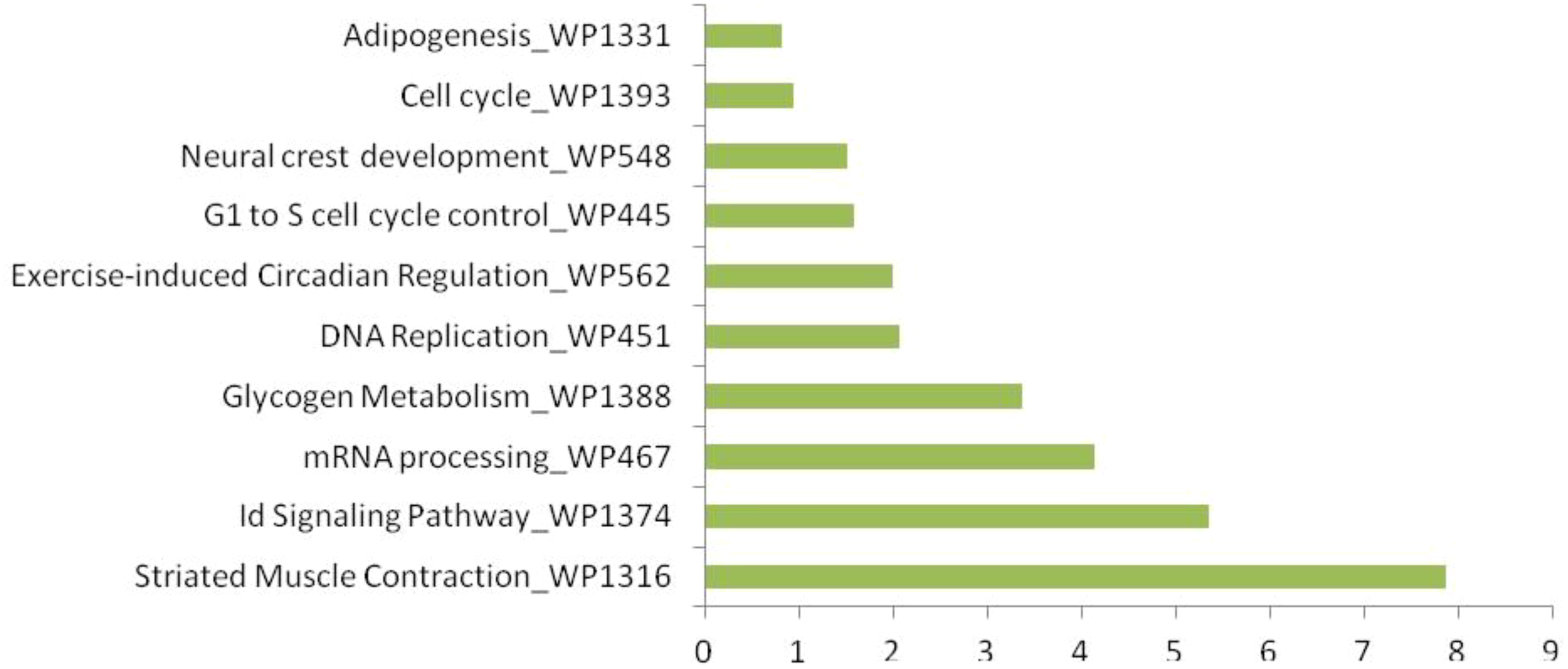 Top 10 WikiPathways enriched in significantly upregulated proteins (FDR < 0.05). Pathways related to mRNA processing, muscle contraction, and cell cycle were prominent.