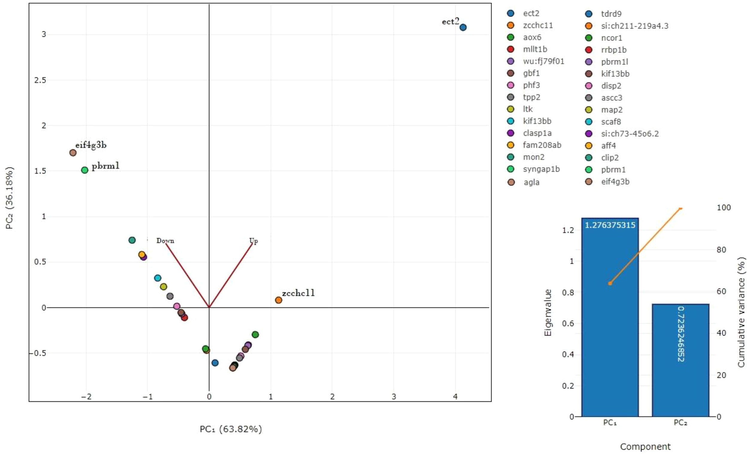 PCA revealed a distinct separation between the control and triclosan-treated groups, highlighting significant proteomic shifts (Figure 11). ECT2 and Zcchc11 were highly upregulated in the treated group, suggesting their involvement in cellular growth and division. Conversely, EIF4G3B and PBRM1 were downregulated, indicating a suppression of mRNA translation initiation and chromatin remodeling. These expression patterns suggest a disruption of critical cellular processes.
