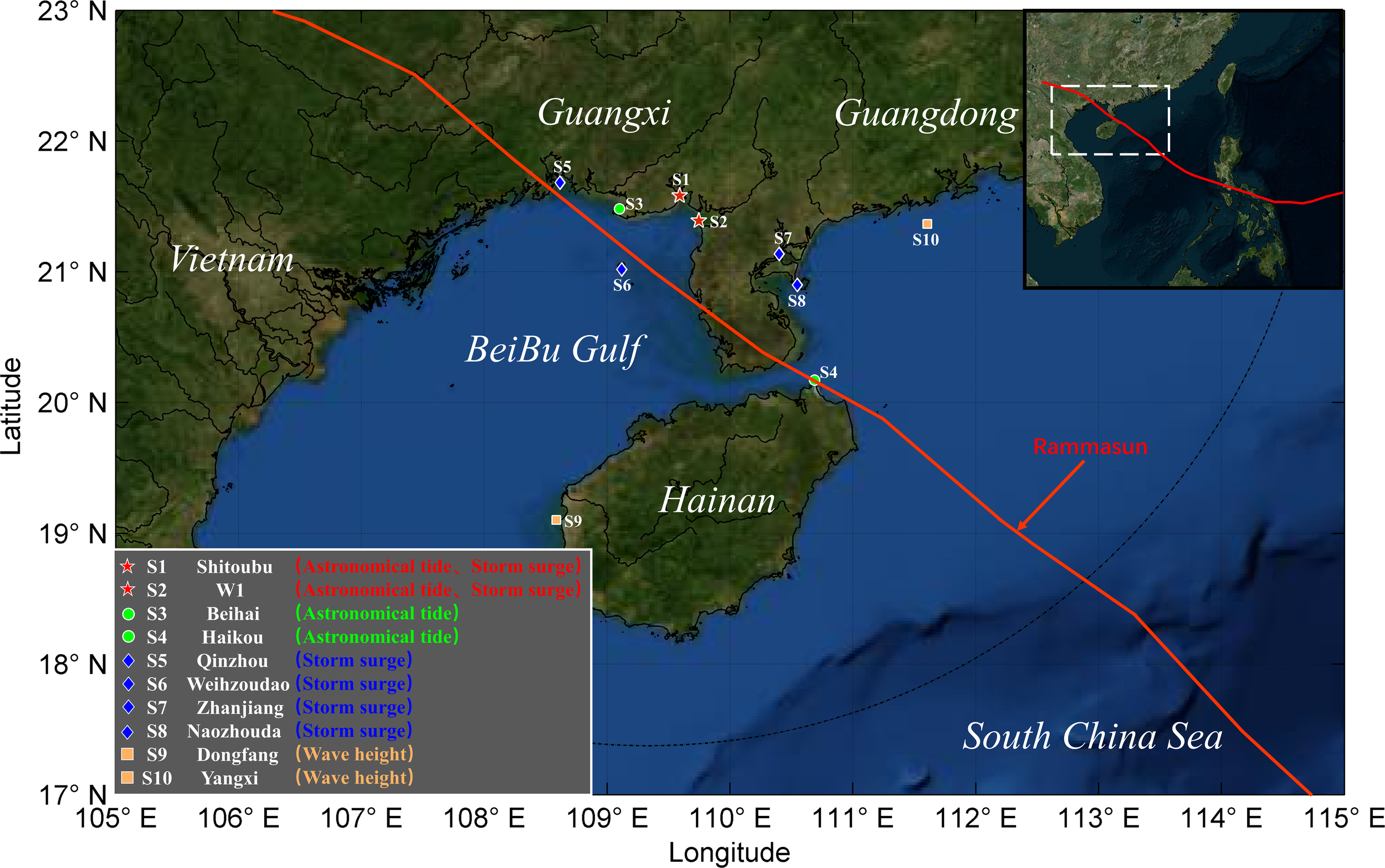 Study area of the Beibu Gulf, the track of Typhoon Rammasun (2014) and the location of validation stations.