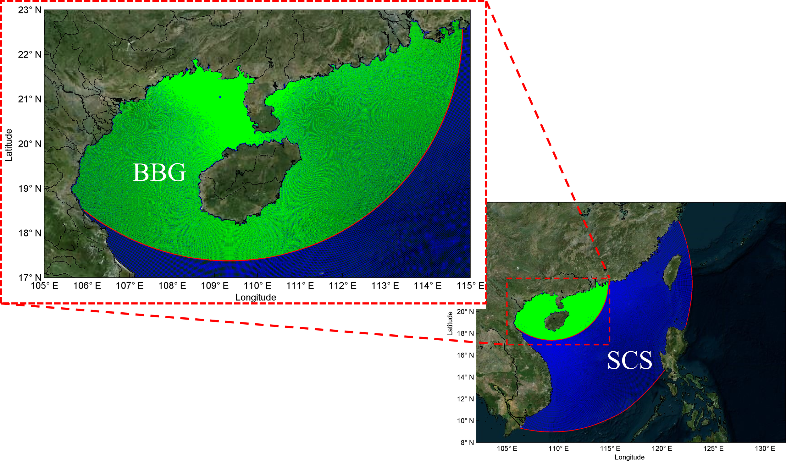 The Beibu Gulf, situated at the northwest end of the South China Sea, is one of the world crucial international regional economic cooperation zones. The Beibu Gulf is a typical semi-enclosed shallow-water bay, with an average water depth of approximately 42 meters. It borders the Guangxi Zhuang Autonomous Region of China in the north, faces the Leizhou Peninsula and Hainan Island of China in the east, and is adjacent to Vietnam in the west. Notably, the the strategy of promote economy cooperation around Beibu Gulf have been approved by the national leaders from these two countries. The bay covers approximately 105°39′E~110°02′E and 18°08′N~21°53′N, with a total area of about 130,000 km2. The coastline is winding and convoluted, showing a total length of ~ 1600 km.