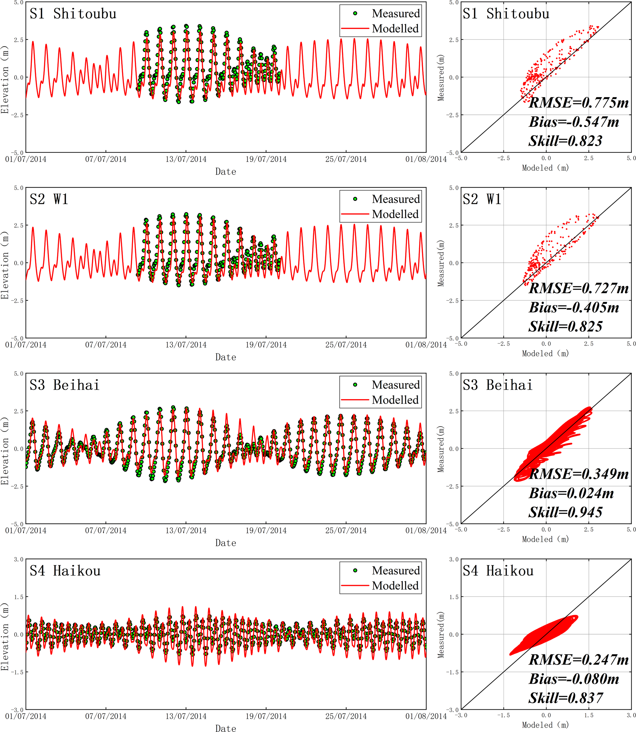 Since the accurate simulation of astronomical tide is a prerequisite for typhoon process hindcast, the astronomical tide process was firstly verified based a simulation (without considering meteorological forcing) running between June 1, 2014 and August 1, 2014. The modelling results exhibit a good agreement with the observational data at stations S1, S2, S3, and S4, indicating that the model could accurately capture the astronomical tide process (Figure 4).